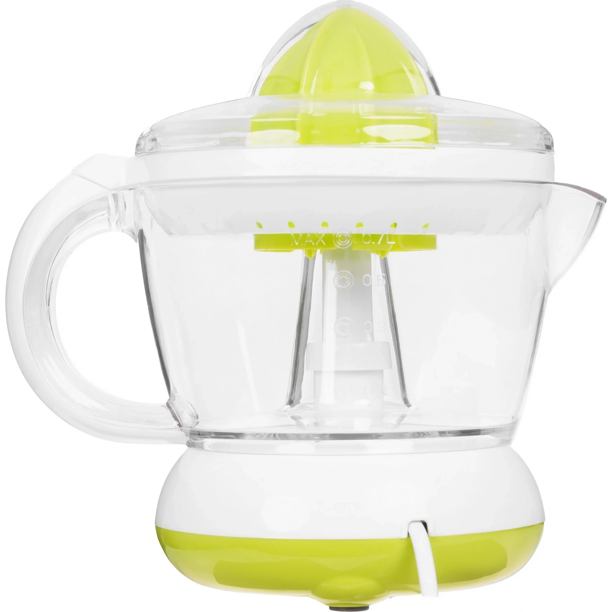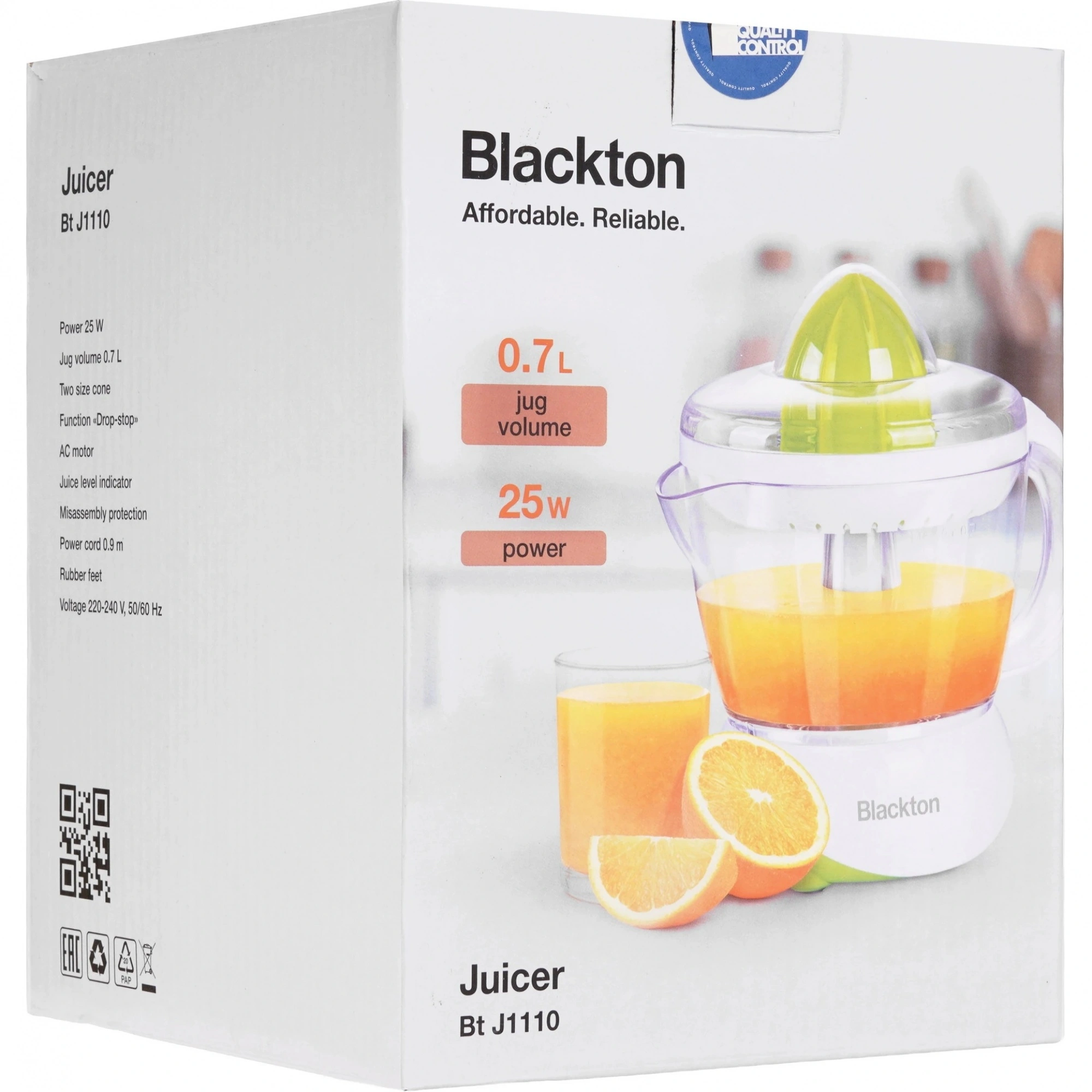 Соковыжималка электрическая Blackton Bt J1110 White белого цвета используется для получения сока из цитрусовых. При мощности двигателя 25 Вт она развивает до 60 об/мин и справится только с мягкими фруктами: апельсинами, грейпфрутами, лимонам, мандаринами. В импульсном режиме устройство работает короткими циклами на максимальной мощности. Это позволит обрабатывать продукты с волокнами и точно контролировать процесс. В емкости на 700 мл поместится 2-3 порции напитка по 250-350 мл.
