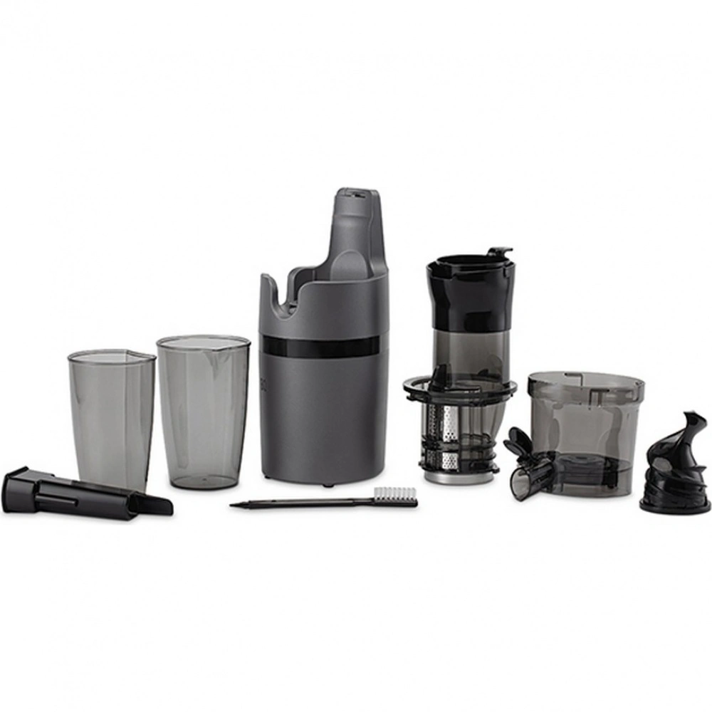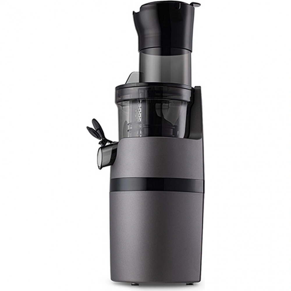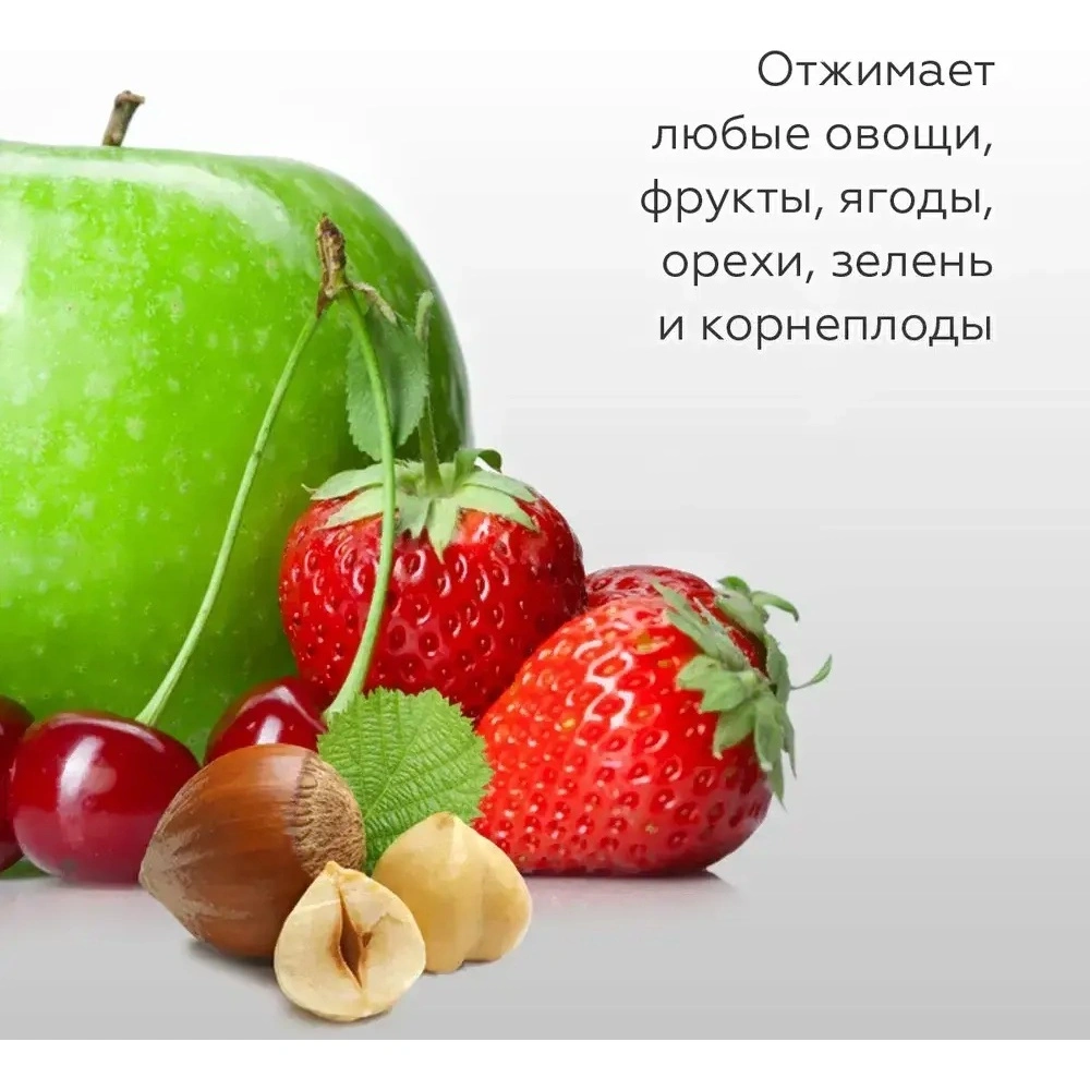 Соковыжималка оснащена одним шнеком и поддерживает максимальную скорость вращения 65 оборотов в минуту, что способствует эффективному извлечению сока. Объем емкости для готового напитка составляет 0,8 литра, что достаточно для приготовления нескольких порций свежего сока за один раз.