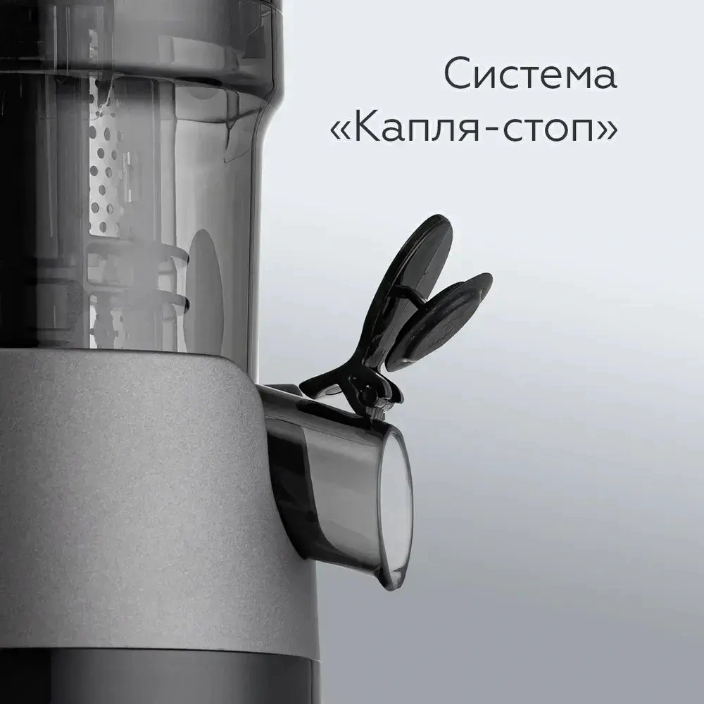 Вес устройства составляет всего 2,58 кг, что делает его достаточно компактным и легким для повседневного использования и хранения. Корпус соковыжималки выполнен из прочного пластика и представлен в стильном сером цвете, что позволяет ей гармонично вписаться в любой интерьер.