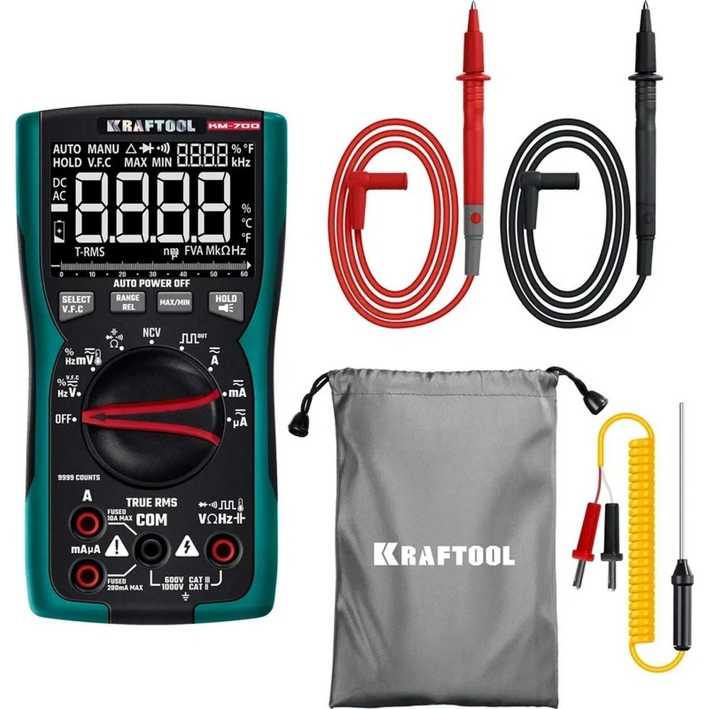 Профессиональный автоматический цифровой мультиметр KRAFTOOL гарантирует наивысшую точность измерений. Применение высококачественных материалов обеспечивает длительный срок службы. Прибор имеет функции измерения переменного и постоянного напряжения, сопротивления, емкости, проверки целостности цепей со звуковым сигналом, проверки диодов, измерения переменного и постоянного тока, измерение частоты до 100 МГц, измерение температуры и режим относительных измерений.