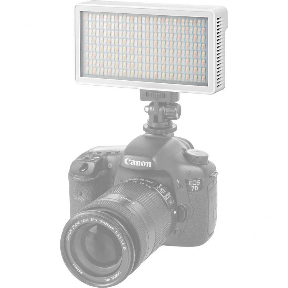 Светодиодный осветитель, Силиконовый рассеиватель, Кабель USB, Наклонный кронштейн с «холодным башмаком», Руководство по эксплуатации и гарантийный талон
