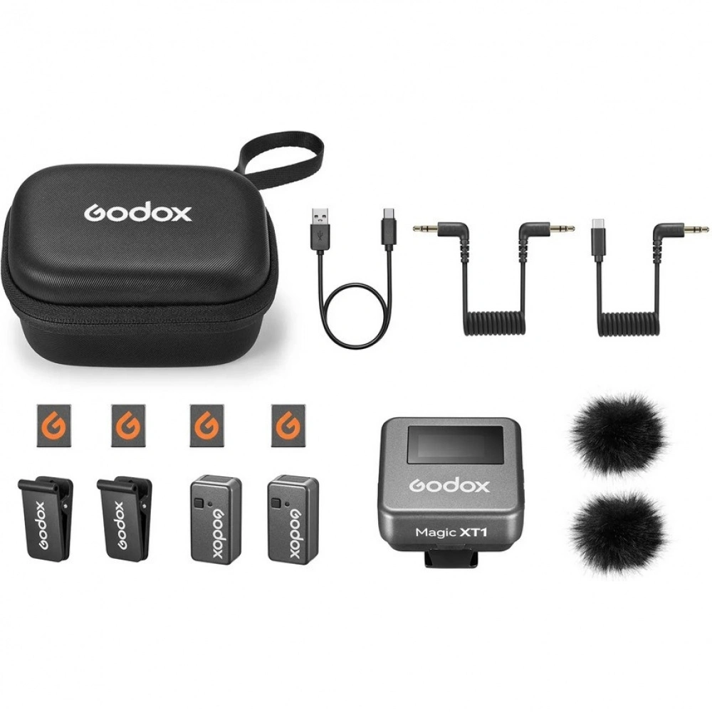 Godox Magic XT1 — двухканальная беспроводная микрофонная система нового поколения, оснащенная двумя ультракомпактными передатчиками, удобно размещаемыми прямо внутри приемника, выполняющего также роль зарядного футляра. Радиосистема Magic XT1 для двух спикеров может использоваться с цифровой камерой или смартфоном с разъемом USB-C или Lightning. Совместимость как с Android, так и с iOS устройствами делает Magic XT1 универсальным решением для записи звука высокого качества с любым мобильным устройством.