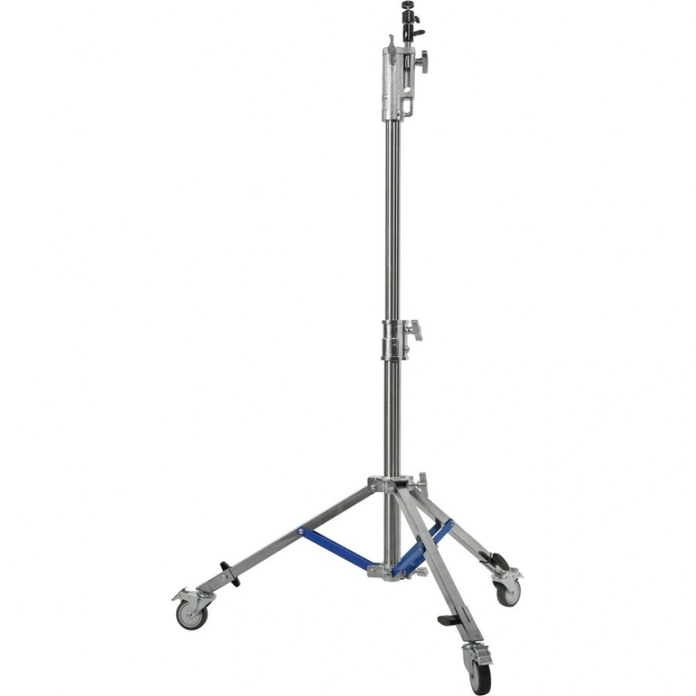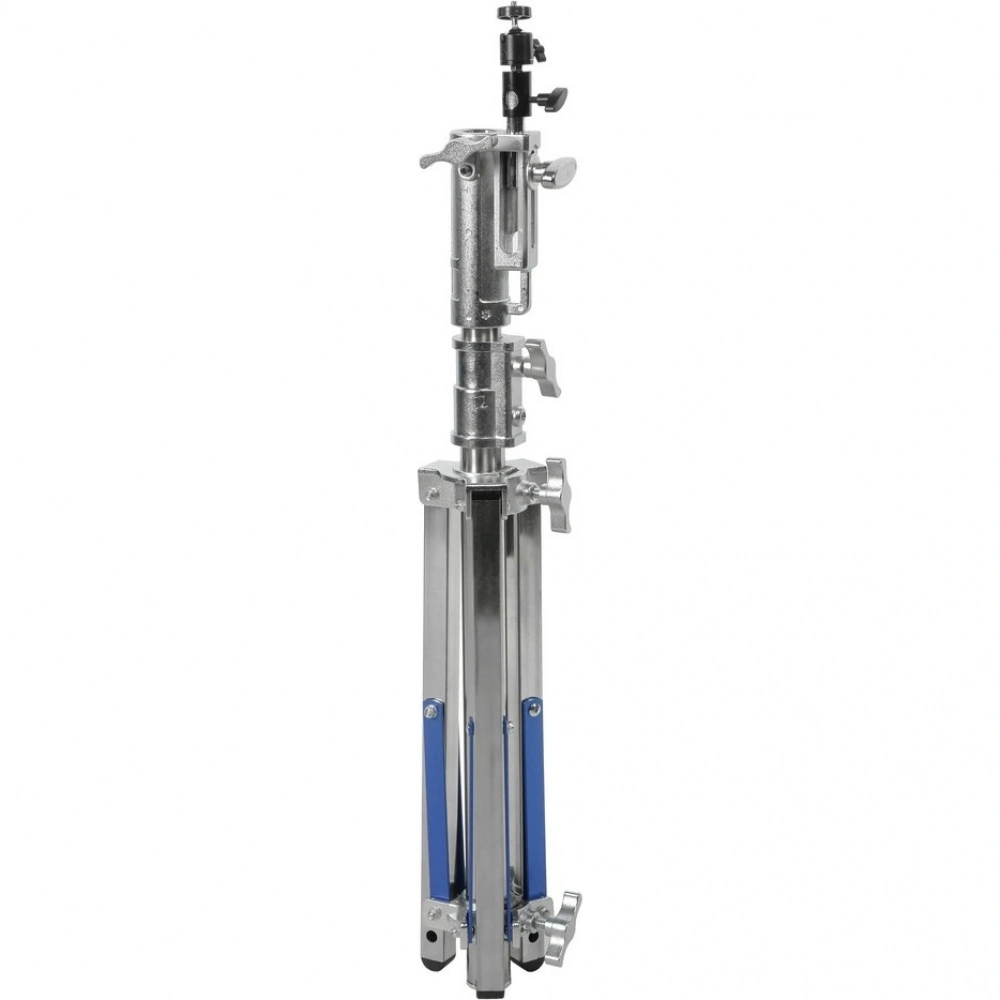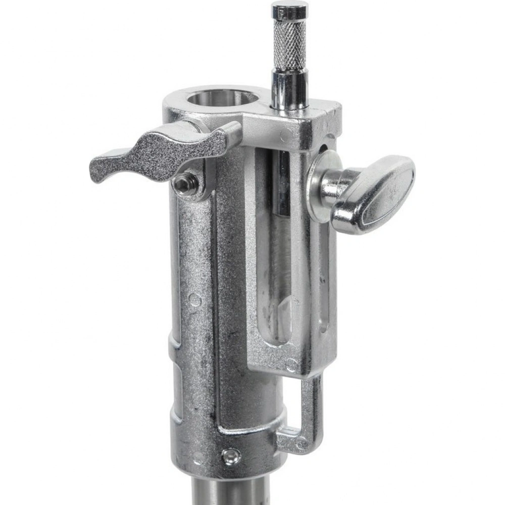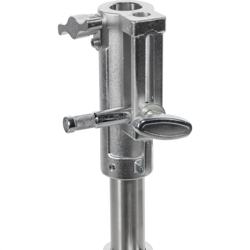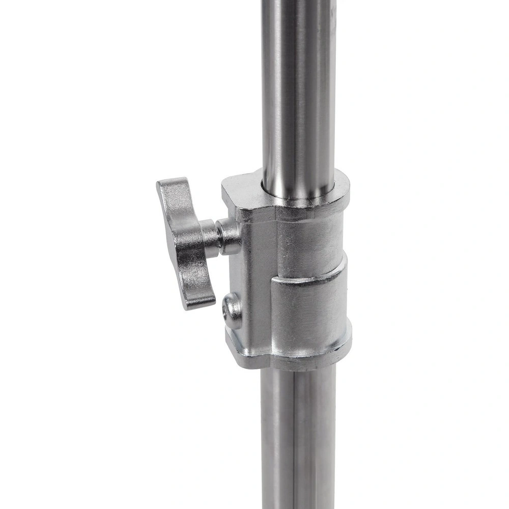 Стойка изготовлена из цельной стали, что гарантирует жесткость и устойчивость при полной нагрузке. Телескопическая двухсекционная колонна на треноге достигает максимальной высоты 150 см. Большой диаметр секций (40/35 мм) обеспечивает оптимальную жесткость и распределение нагрузки, минимизируя раскачивание. Секции надежно фиксируются усиленным винтовым зажимом.