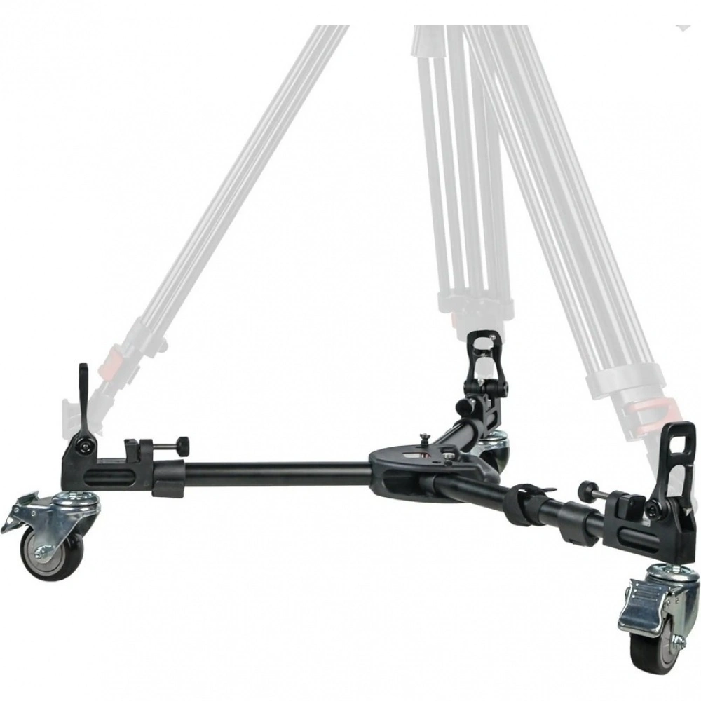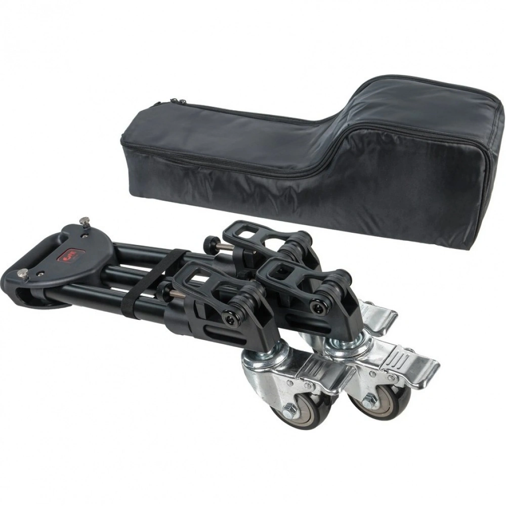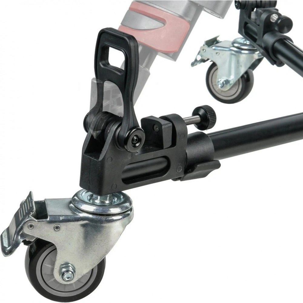 Три резиновых колеса диаметром 75 мм гарантируют плавный и бесшумный ход, что особенно важно при видеосъемке. Благодаря повороту колес на 360 градусов тележка обладает высокой маневренностью в ограниченном пространстве. На каждом колесе установлен индивидуальный тормоз для надежной фиксации во время работы.