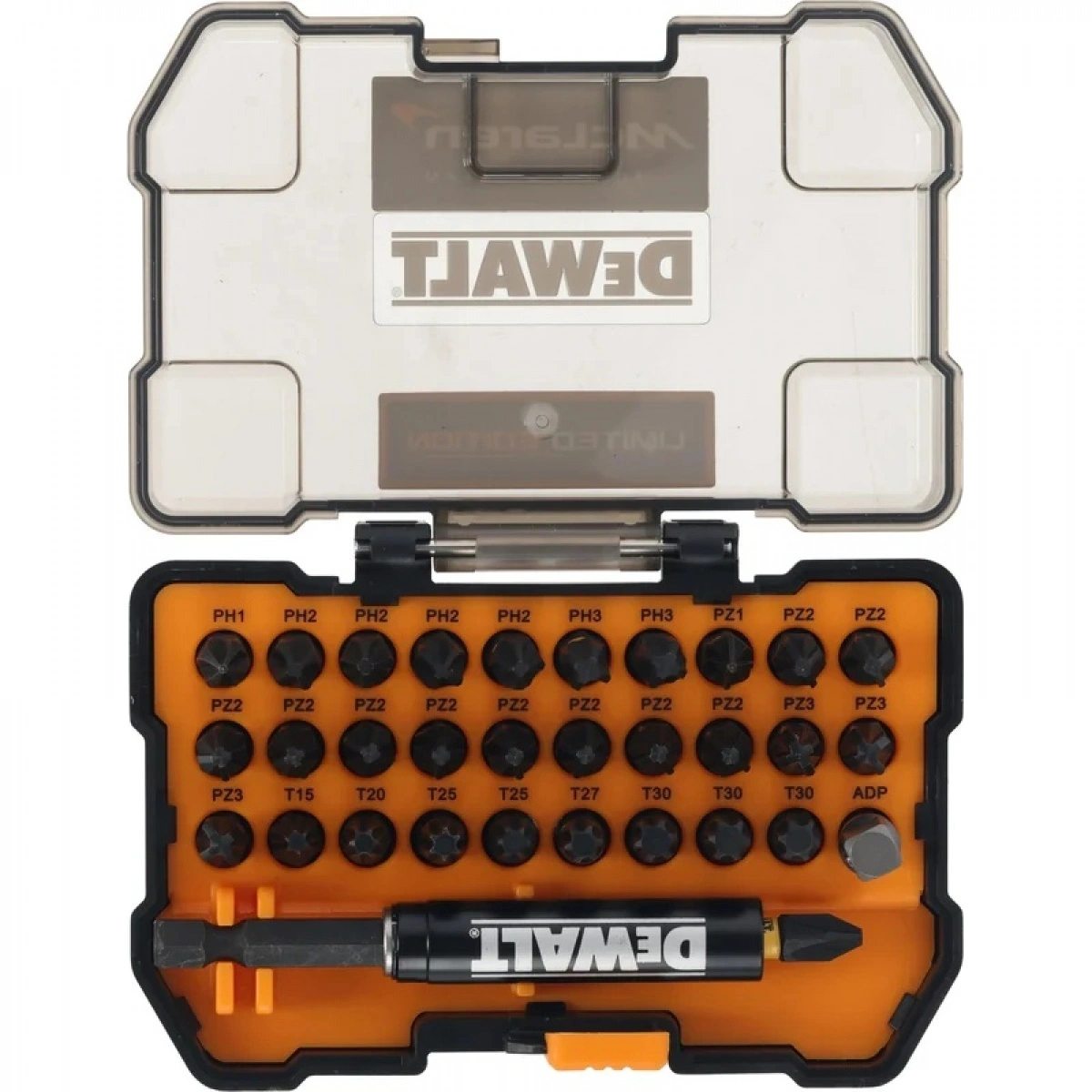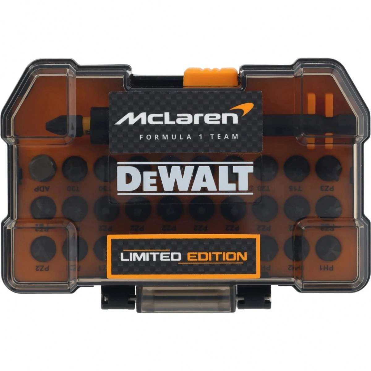 Всемирно известный бренд DeWALT стал официальным партнером по поставке инструментов для команды McLaren Formula 1. В знак дружеских отношений компания DeWALT недавно выпустила лимитированную серию продукта, в том числе набор бит DT70900T в фирменном кейсе. В комплект входят биты 25 мм (1xPH1, 5xPH2, 2xPH3, 1xPZ1, 10xPZ2, 3xPZ3, 1xT15, 1xT20, 2xT25, 1xT27, 3xT30) с хвостовиком HEX 1/4", магнитный держатель бит, а также угловой адаптер. Кейс оснащен клипсой для ношения на ремне.
