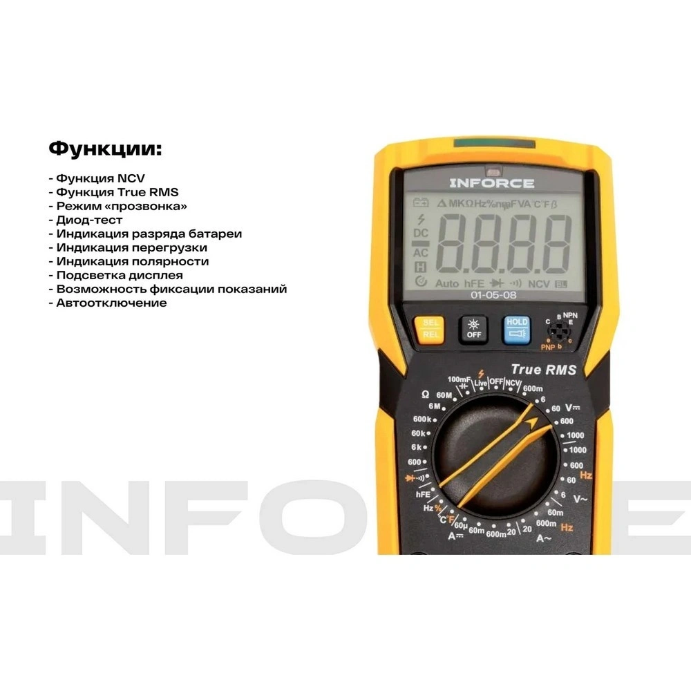 Измерительное оборудование Inforce представляет собой многофункциональный инструмент, специально разработанный для точного измерения различных электрических величин. Это устройство отлично подойдет как для профессионалов, так и для домашних мастеров, благодаря сочетанию высокой точности и удобства в использовании.