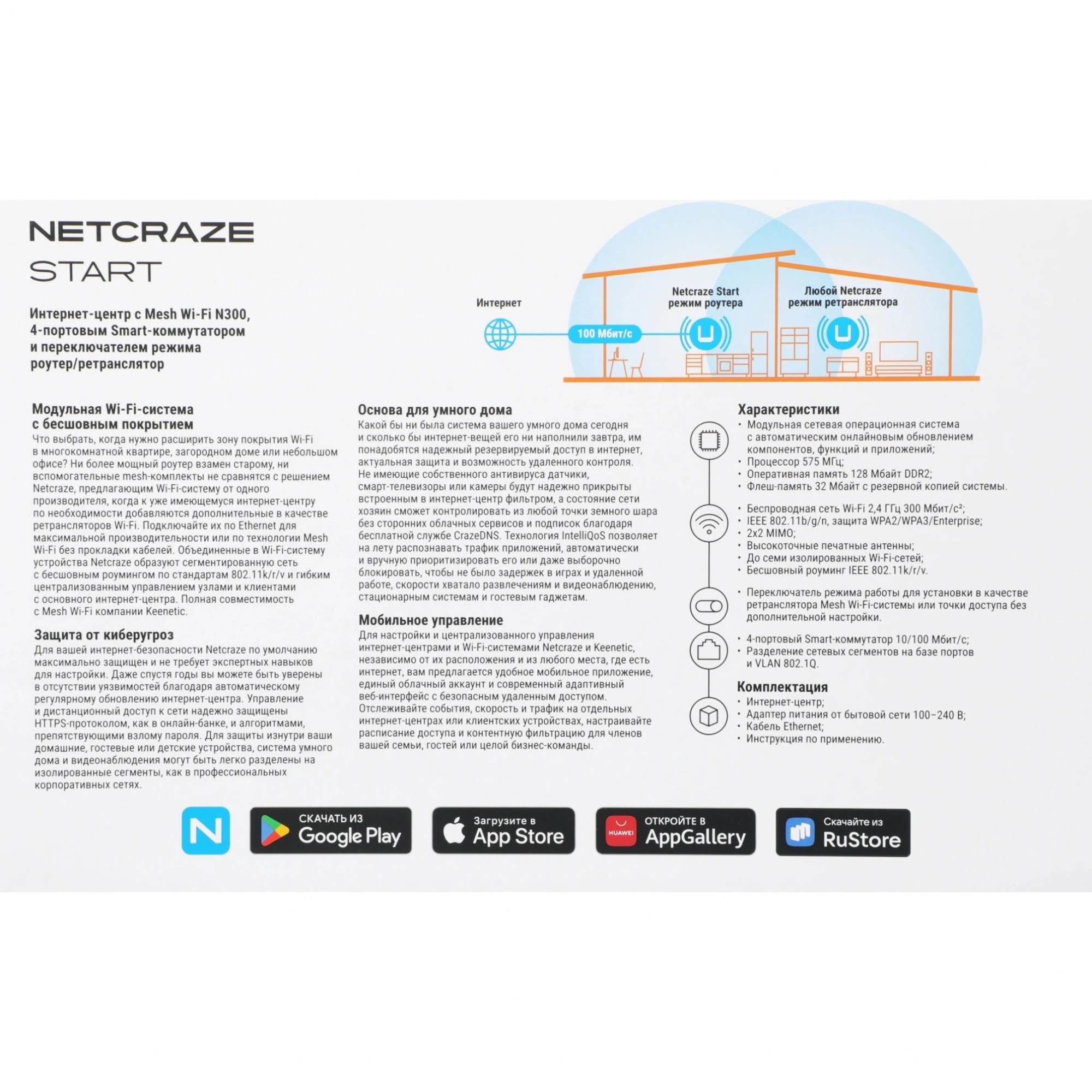Wi-Fi роутер Netcraze Start является моделью стандарта N300 начального уровня, которая обеспечивает скорость соединения в пределах 300 Мбит/с. В конструкции компактного роутера предусмотрены 2 внешние антенны, которые способствуют улучшению сигнала и расширению покрытия. Для организации проводного подключения предлагаются 3 разъема LAN 100 Мбит/с. Технологии защиты помогают предотвратить доступ к сети посторонним пользователям. Интуитивный веб-интерфейс или приложение на смартфоне гарантируют простую настройку параметров роутера Keenetic Start.