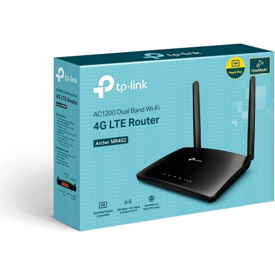 Маршрутизатор TP-LINK Archer MR402 обеспечивает бесперебойную работу большого количества одновременных соединений. Cеть 4G позволяет подключить до 64 устройств Wi-Fi и наслаждаться скоростью загрузки до 150 Мбит/с. TP-LINK Archer MR402 AC1200 Wi-Fi – создает одновременные двухдиапазонные сети Wi-Fi с максимальной скоростью до 300 Мбит/с в диапазоне 2,4 ГГц и 867 Мбит/с в диапазоне 5 ГГц.