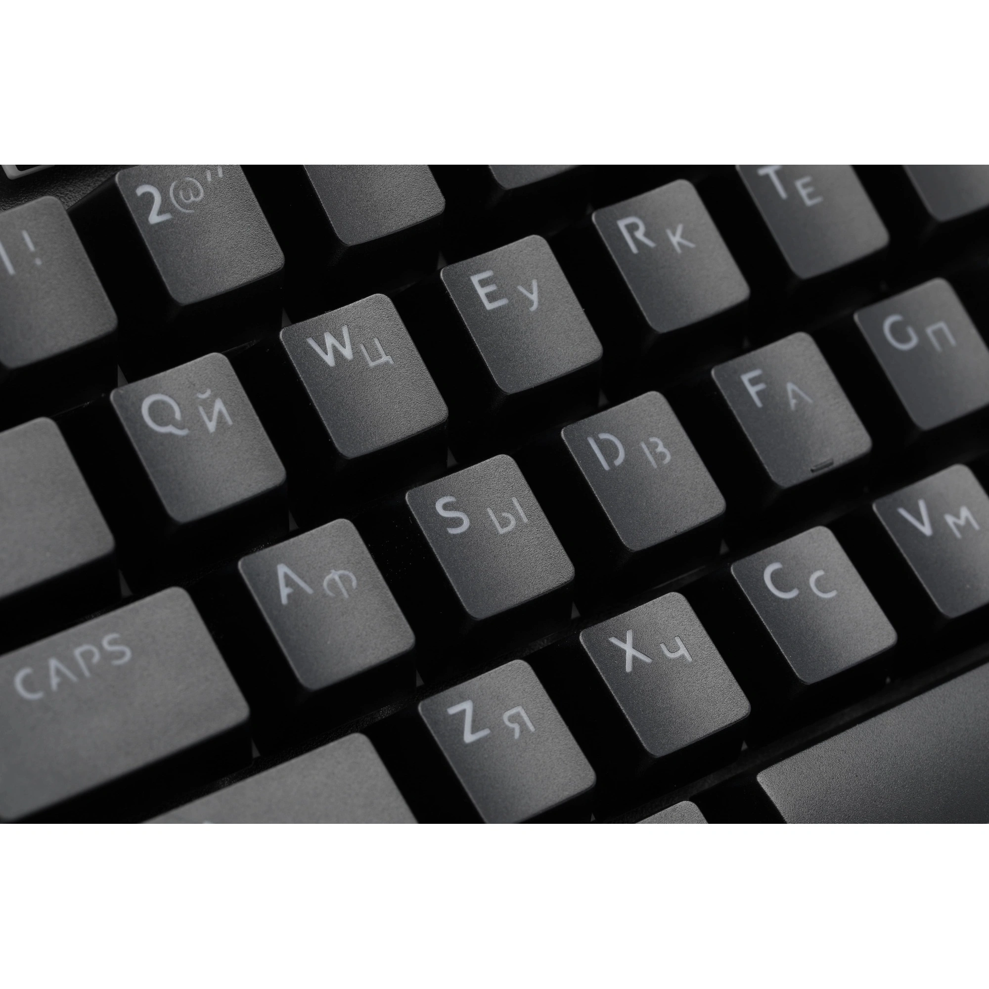 Defender Mechanoid GK-581 [45581] в пластиковом корпусе черного цвета синхронизируется с необходимым устройством через 1.5-метровый кабель. Кейкапы выполнены по технологии двойного литья Double-shot, не допускающей истирания символов. Жизненный цикл модели рассчитан на 50 млн кликов. Отсутствие цифрового блока указывает на компактное размещение аксессуара на рабочем столе.