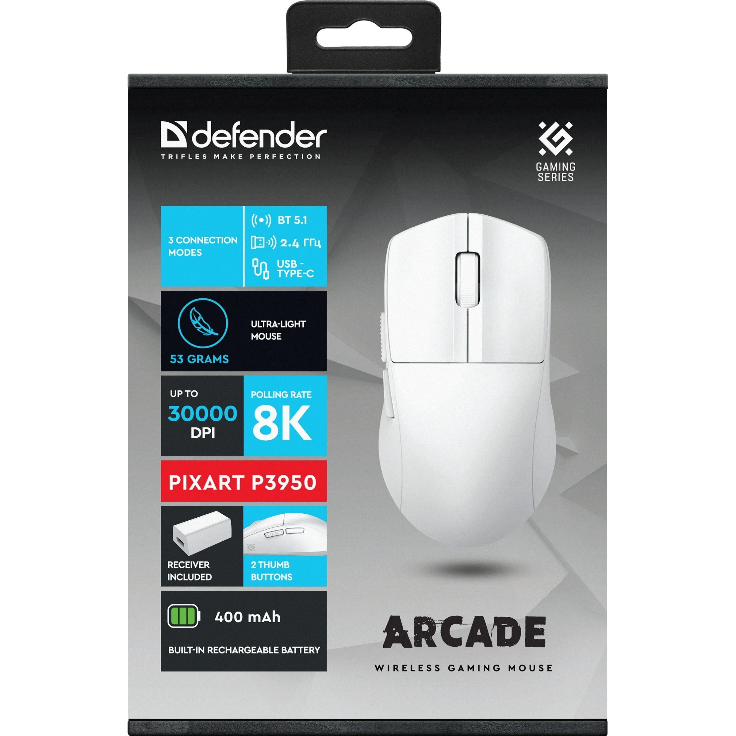 Безусловный хит от Defender для продвинутых геймеров и киберспортсменов: модель Arcade PRO GM-381 - ультралегкая компьютерная мышь весом всего 53 грамма, которая обеспечивает невероятную производительность благодаря сенсору Pixart P3950. Данная модель имеет высокую частоту опроса - 8000 Гц, ускорение 50 g, скорость отслеживания - 750 IPS, а также высокое разрешению сенсора - до 30000 DPI. Доступны три режима подключения: проводное, беспроводное через Bluetooth и по радио каналу (8К-ресивер входит в комплект), что делает её универсальным решением для любых задач. Мышь оснащена встроенной перезаряжаемой батареей емкостью 400 мАч, обеспечивающей работу без подзарядки до 120 часов. Также мышь имеет 5 программируемых кнопок, включая 2 боковые, что позволяет настроить управление под ваши нужды. Эргономичная форма и прорезиненное колесо прокрутки обеспечивают комфорт во время долгой игры, а тефлоновые ножки гарантируют легкое скольжение по любой поверхности.