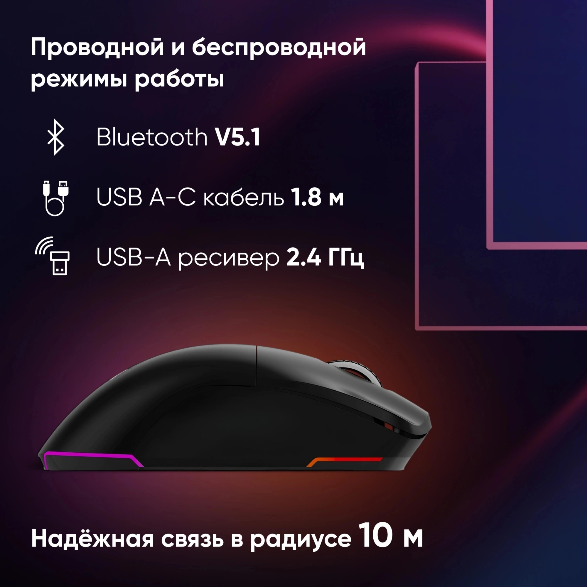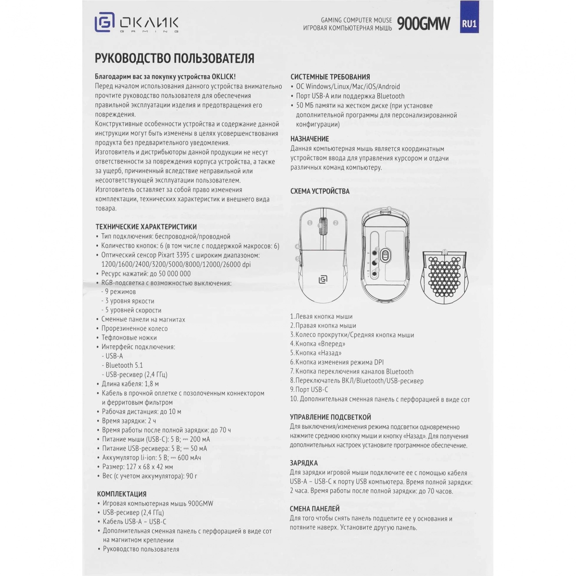 Для подключения к ПК мышь Oklick использует современный оптический сенсор с впечатляющим разрешением в 26000 dpi, что обеспечивает высочайшую точность и скорость реакции в любой ситуации. А благодаря радиоканальному и Bluetooth интерфейсам, вы сможете наслаждаться беспроводной свободой действий на расстоянии до 10 метров от устройства.