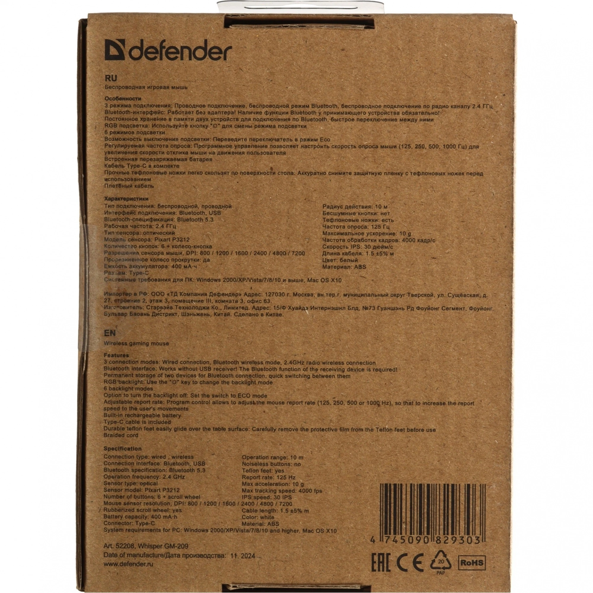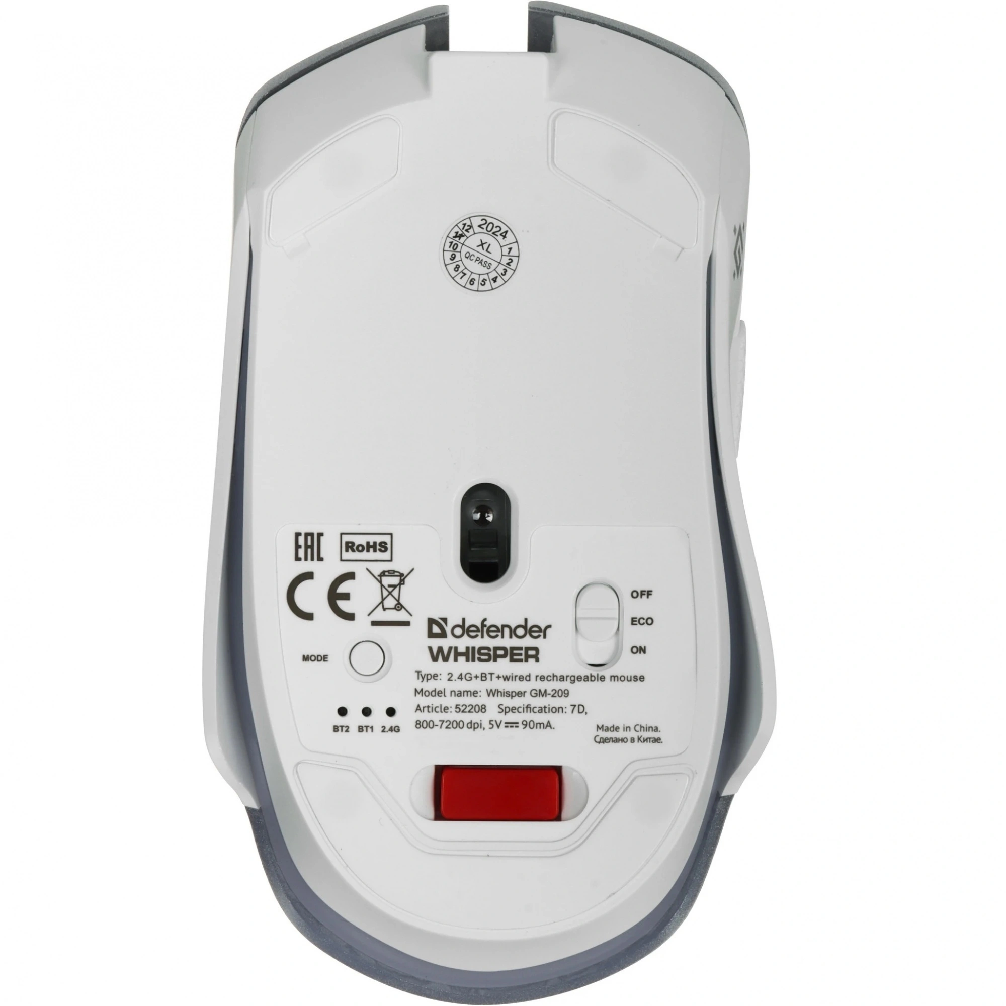 Игровая мышь Defender Whisper GM-209 с тремя режимами подключения: проводной режим, беспроводной режим по радиоканалу 2.4ГГц и беспроводной режим подключения по Bluetooth. В данной модели поддерживается постоянное хранение в памяти двух устройств для подключения по Bluetooth и быстрое переключение между ними.