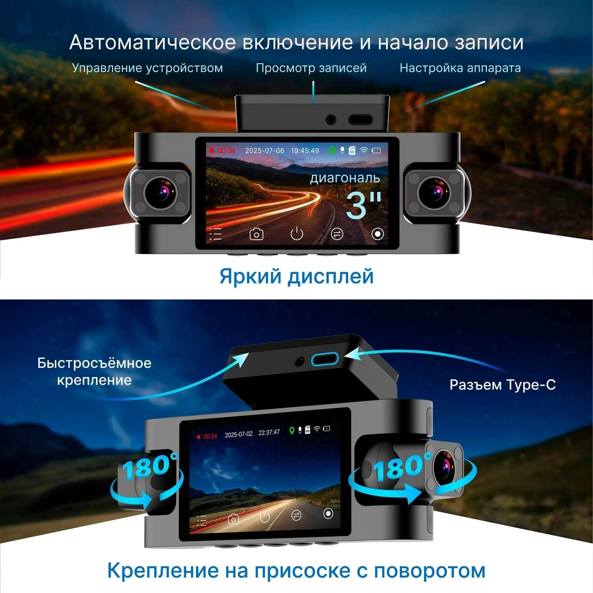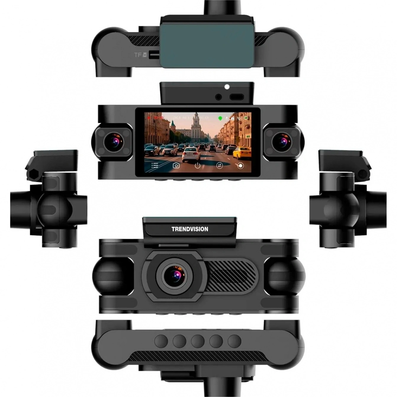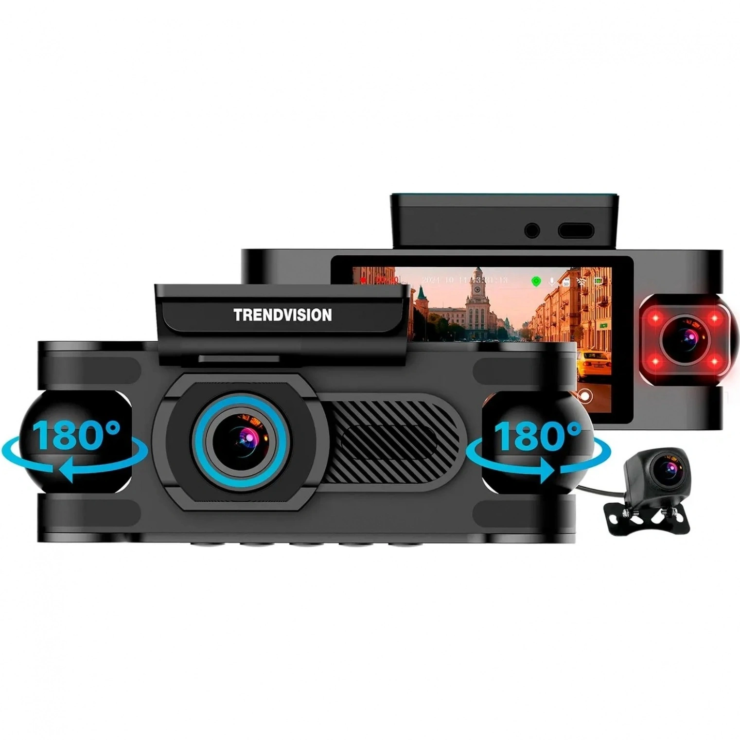 TrendVision Proof 360 GPS – видеорегистратор, который обеспечивает съемку со всех сторон, снаружи и внутри автомобиля. Происходит это за счёт 4-х камер (3 камеры в корпусе + 1 задняя камера). Салонные боковые камеры вращаются на 180° и имеет 8 ИК-светодиода – это позволяет вести улучшенную ночную съёмку в салоне автомобиля. GPS-модуль, автоматически определяющий дату, время, скорость и координаты - в комплекте, встроен в АЗУ. Просматривать видео можно прямо на смартфоне.