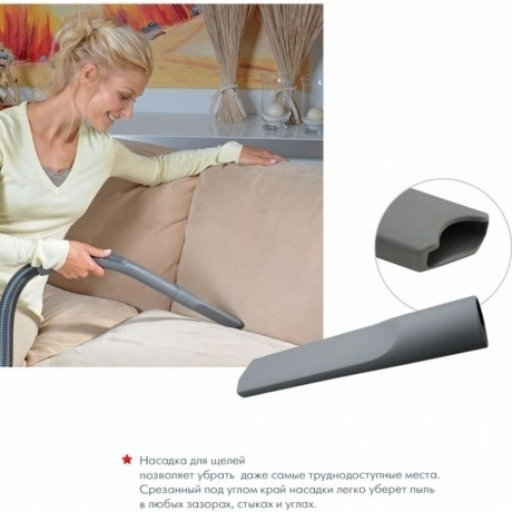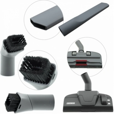 Aqua-Box Compact укомплектован качественными насадками из надежного прочного пластика. В комплектацию входит переключаемая насадка для твердых и ковровых напольных покрытий, щелевая насадка для труднодоступных мест, а также щетка-кисточка для деликатных поверхностей.