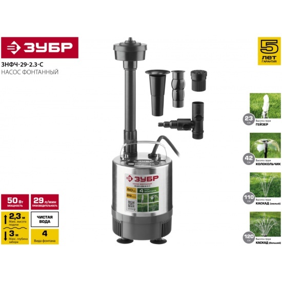 Насос фонтанный Зубр ЗНФЧ-29-2.3-С фиксируется на пластиковом или плиточном дне водоема посредством специальных присосок. Наличие губчатого фильтра эффективно защищает устройство от попадания частиц грязи. Размер фильтруемых включений составляет 2 мм, поэтому модель оптимальна для работы с чистой водой. Температура жидкости должна быть в диапазоне от +1 до +35°С. Корпус из нержавеющей стали эффективно защищает внутренние элементы от неблагоприятного внешнего воздействия, а также не подвержен возникновению коррозии. Низкая мощность потребления обеспечивает экономию на оплате коммунальных счетов.Насос фонтанный Зубр ЗНФЧ-29-2.3-С выдерживает погружение на глубину до 3 м, что возможно благодаря герметичной конструкции корпуса. Оптимальная производительность устройства обусловлена пропускной способностью 1,74 м?/ч. Длинный кабель позволяет установить модель на значительном расстоянии от электросети. Насос предназначен для декорирования искусственного пруда фонтаном или водопадом. Для изменения формы струи в комплекте есть соответствующие насадки. Устройство рассчитано на длительный период эксплуатации.