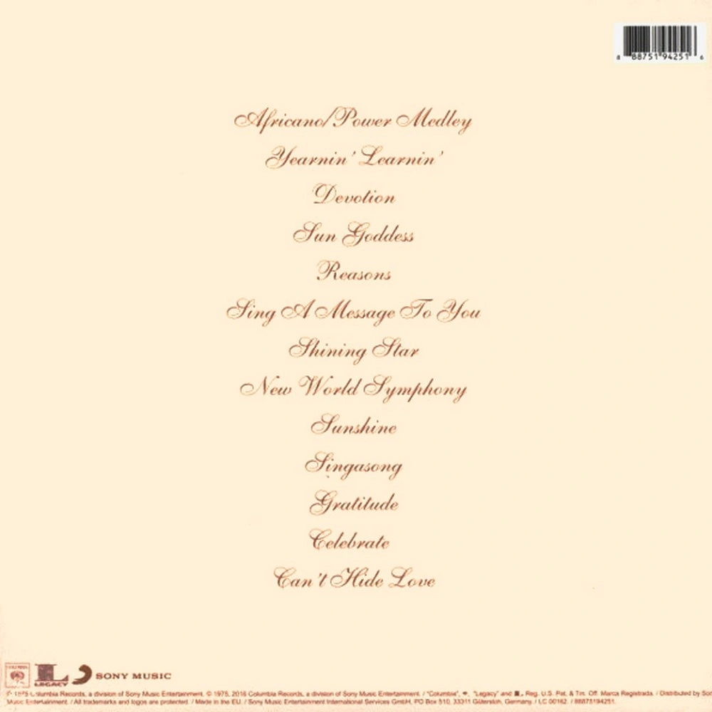 Africano/Power, Yearnin' Learnin', Devotion, Sun Goddess, Reasons, Sing a Message to You, Shining Star, New World Symphony, Sunshine, Sing a Song, Gratitude, Celebrate, Can't Hide Love