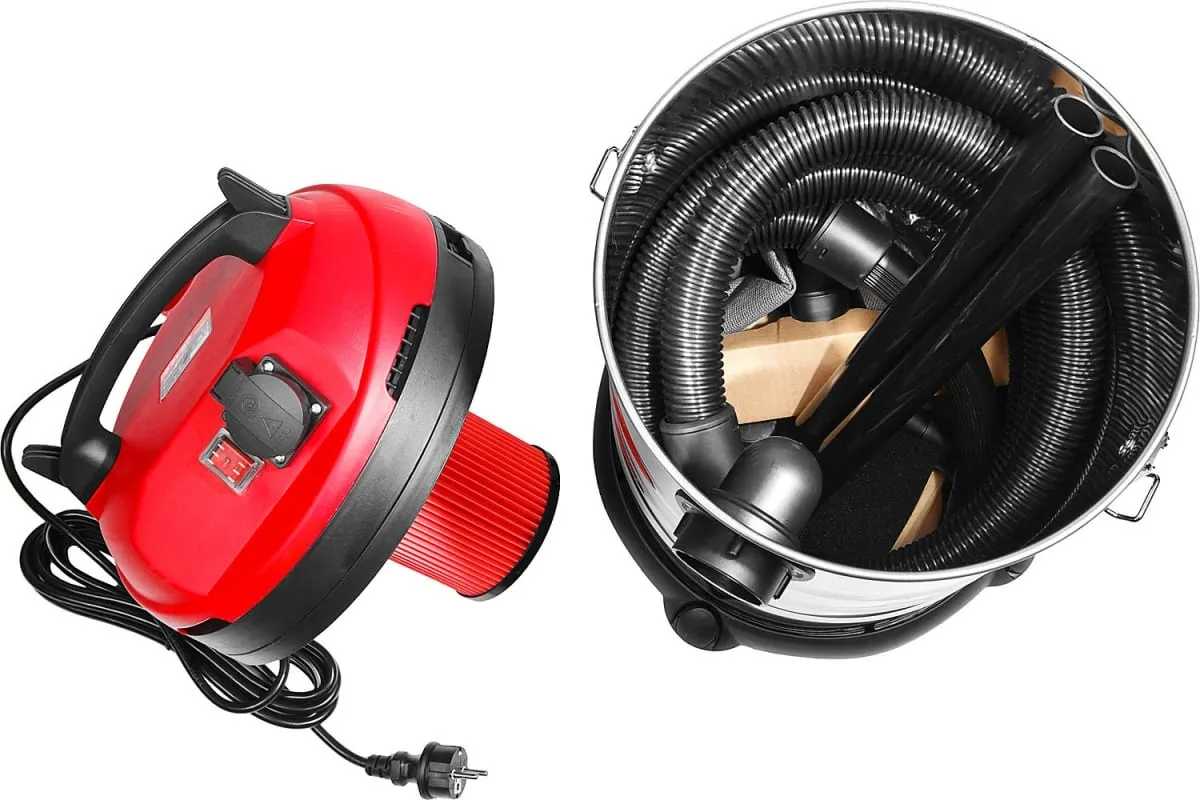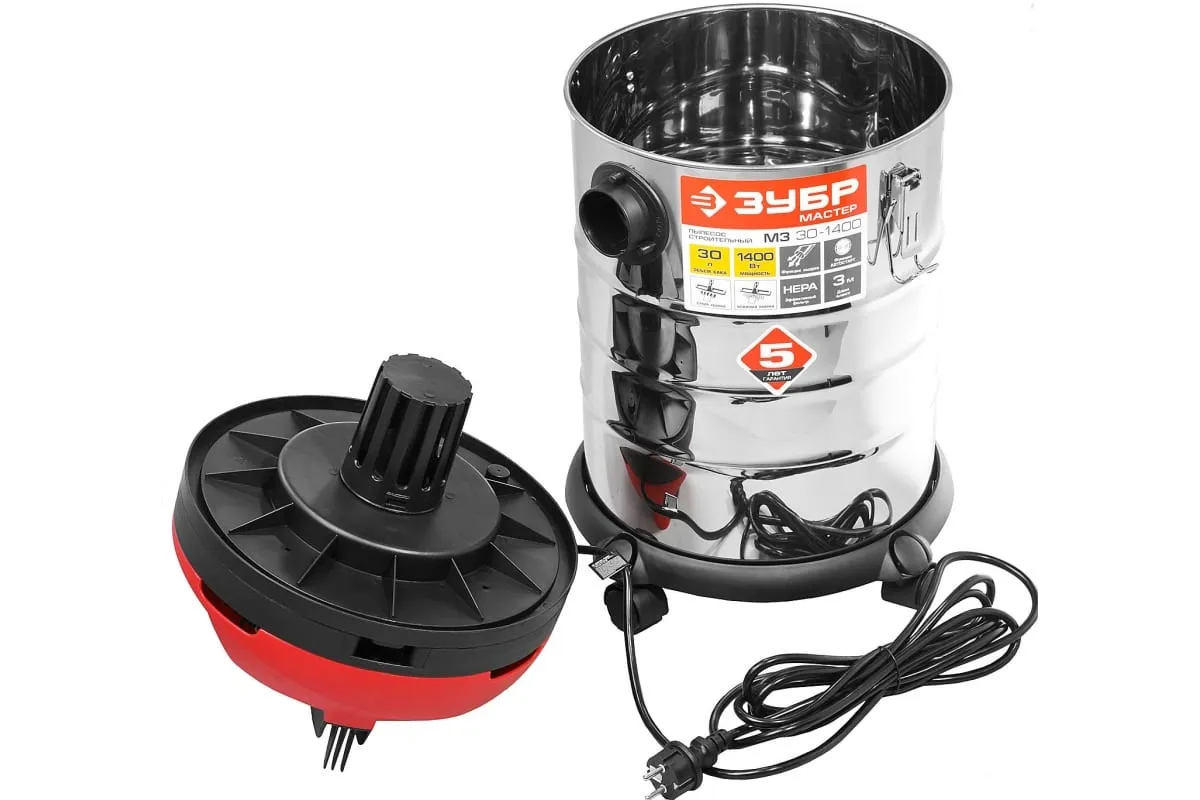 Строительный пылесос Зубр ПУ-30-1400 М3 выполнен в вертикальном корпусе со стальным баком объемом 30 л. Обладая мощностью 1400 Вт, прибор будет эффективен как для сбора сухого мусора, так и для влажной уборки. Он позволяет собирать жидкости в бак, поддерживает функцию выдува. Благодаря этому устройство подходит для сдува листвы и мусора с дорожек. Герметичность корпуса Зубр ПУ-30-1400 М3 и надежный коллекторный двигатель позволяют пылесосу демонстрировать стабильно высокую силу всасывания. Он использует НЕРА-фильтр для защиты двигателя от частиц пыли и более высокой чистоты уборки.