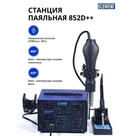 Станция паяльная Element 852D++ - характеристики, описание товара, фото и цены представлены на карточке товара. Этот товар вы можете купить по цене 6334 руб., позвонив по телефону 8(800)505-43-75 в Нижнем Новгороде, или оформив покупку через корзину.