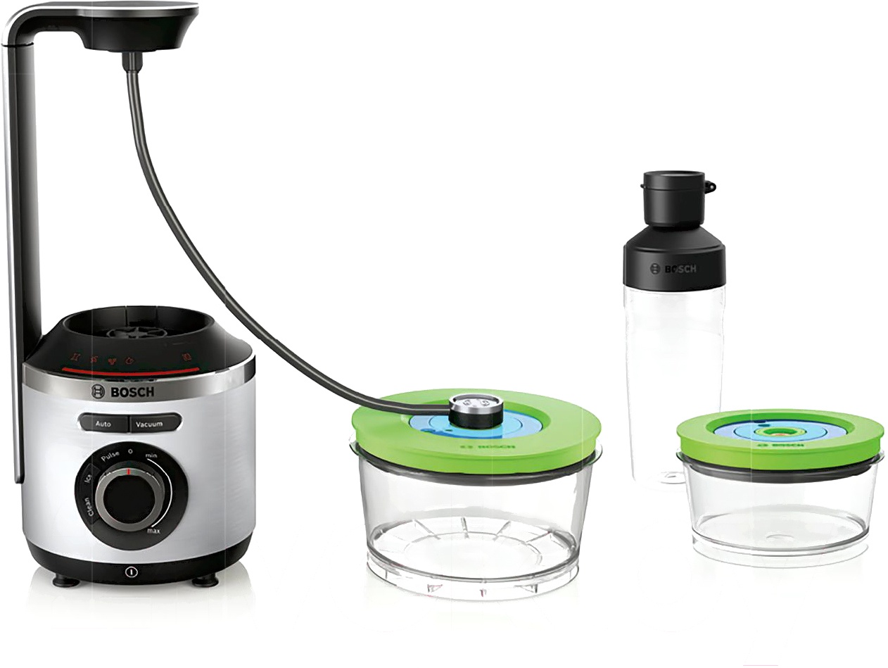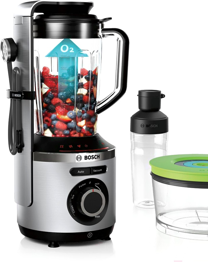 Блендер Bosch MMBV625M VitaMaxx идеально подходит для приготовления смузи и спортивных коктейлей. Он снабжен мощным мотором, раскручивающим нож до 37 тысяч оборотов в минуту. Такая скорость разрушает стенки растительных клеток, высвобождая максимальное количество полезных веществ. Устройство также может измельчать продукты в вакууме, защищая витамин C и сложные органические соединения от преждевременного распада. Благодаря этому ваши напитки получаются действительно питательными и полезными.Пользоваться блендером Bosch MMBV625M VitaMaxx очень просто. Он предлагает режимы автоматического измельчения, смешивания без вакуума, колки льда и очистки чаши. Их можно выбрать одним поворотом большого механического регулятора на передней панели. Корпус устройства изготовлен из прочного полированного алюминия — практичного материала, устойчивого к коррозии и сильному нагреву.К блендеру Bosch MMBV625M VitaMaxx прилагаются два вакуумных контейнера, помогающих долго сохранять полезные свойства коктейлей и измельченных продуктов. Вы также получаете вместительный стакан, позволяющий брать напитки в спортзал или на прогулку.