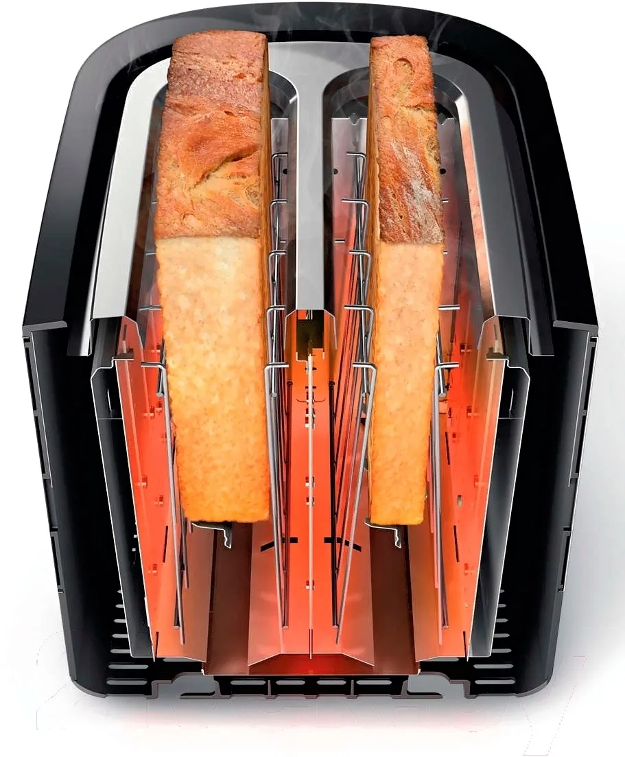 Механизм автоматического центрирования идеально располагает каждый ломтик для равномерного обжаривания вне зависимости от его толщины. Встроенная подставка для удобства подогрева блинчиков и булочек. Режимы разогрева и разморозки для быстрого приготовления замороженных тостов/хлеба. Кнопка отмены позволяет в любой момент остановить приготовление тостов. Простая очистка благодаря съемному поддону для крошек.