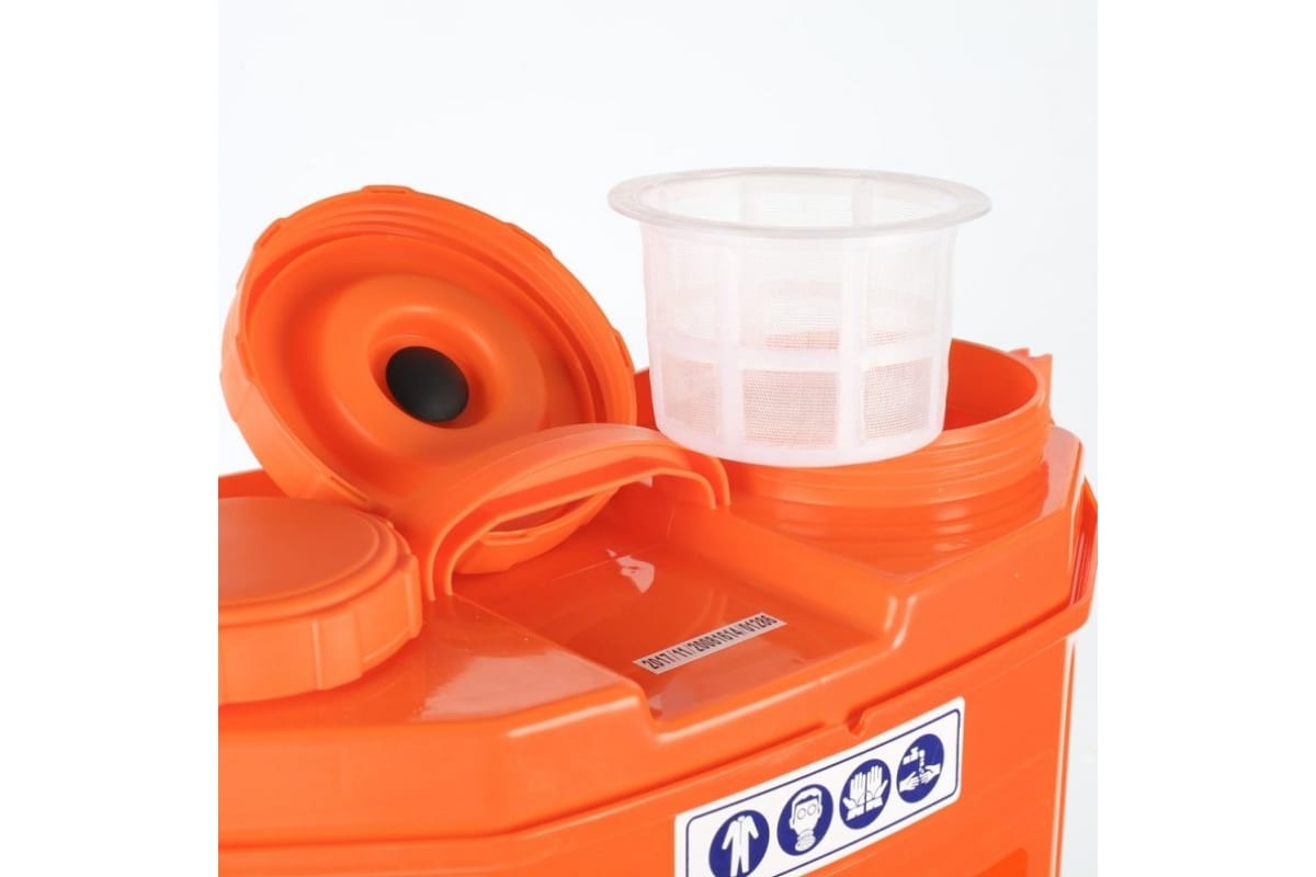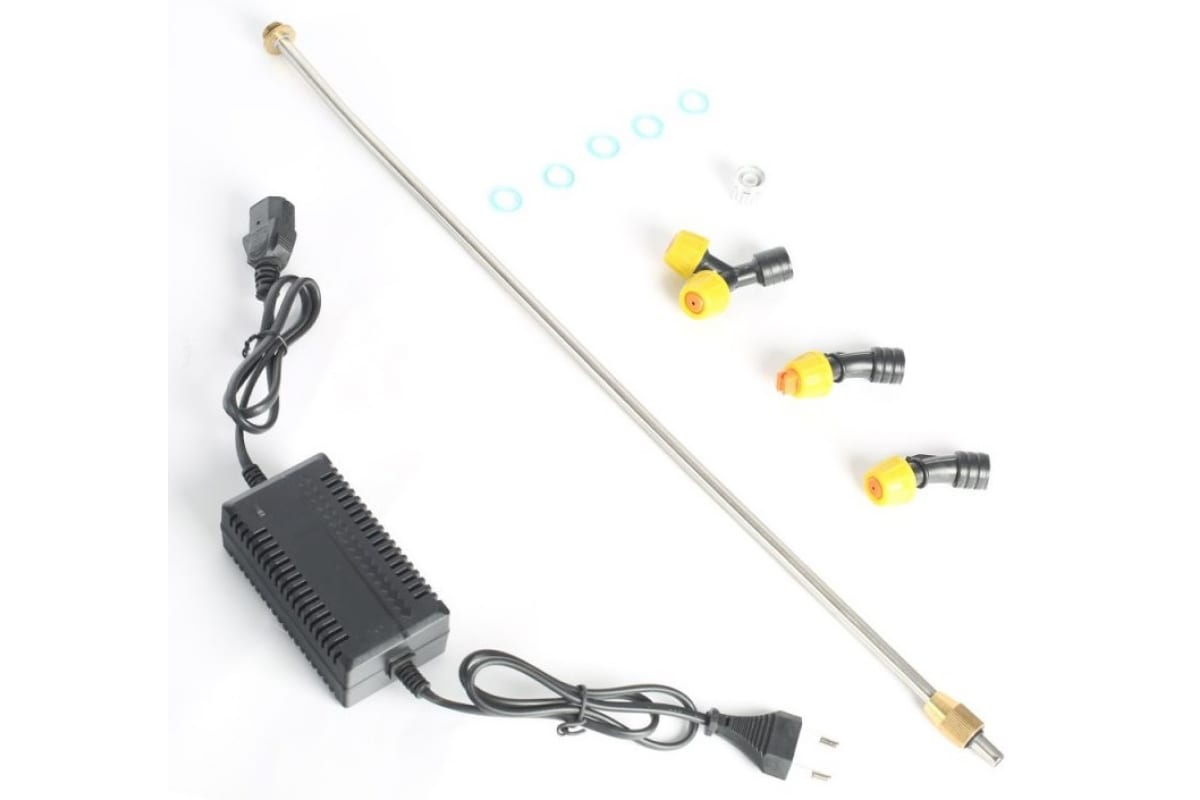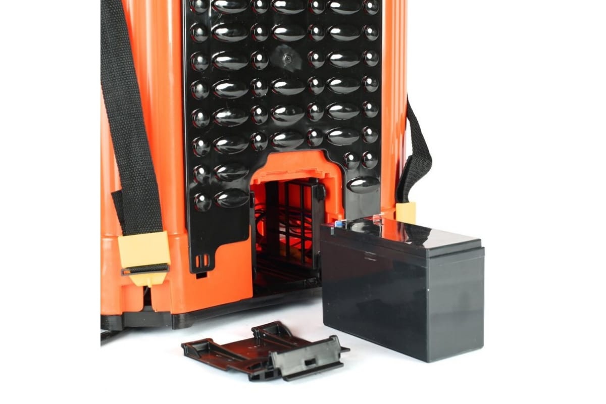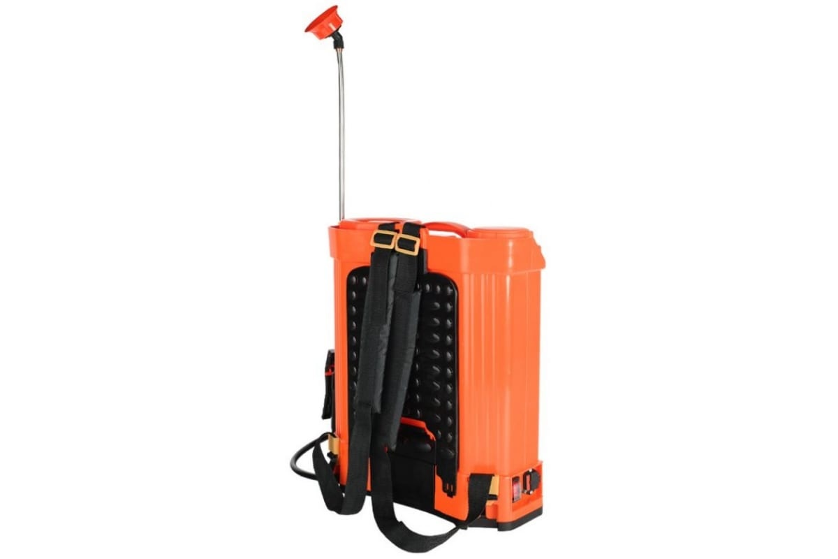 Аккумуляторный садовый опрыскиватель оборудован 16-литровым баком для жидкости. Функционирует от свинцово-кислотной батареи 12 В, 8 Ач. В комплект входят насадки для равномерного распыления раствора. Предусмотрено ременное крепление для удобного ношения агрегата на спине.