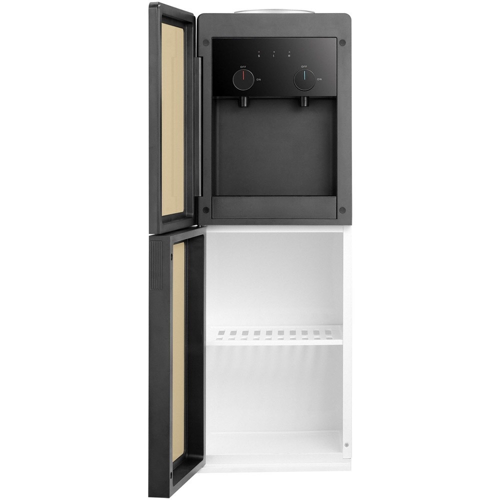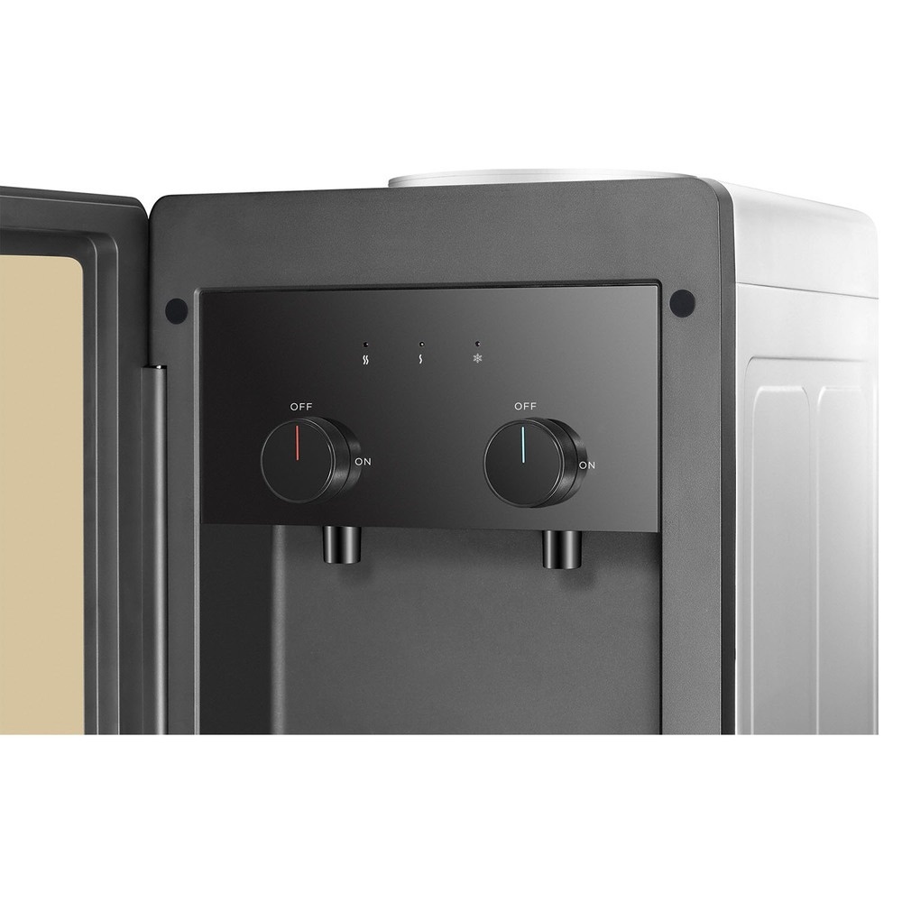 Напольный диспенсер HotFrost V250CE, ставший обладателем элегантной золотистой расцветки корпуса, станет отличным дополнением офиса или общественного заведения. Специальная система подачи воды полностью освободит ваши руки: от вас требуется поставить чашку на каплесборник под соответствующий кран и повернуть регулятор. После того, как кружка наполнится водой, вы поворачиваете регулятор в положение OFF, и подача воды прекращается. Шкафчик для различных принадлежностей, обладающий объемом 36 литров, позволит хранить стаканчики, ингредиенты для приготовления горячих напитков и прочие необходимые предметы. Диспенсер HotFrost V250CE с электронной системой охлаждения в режиме охлаждения действует с производительностью 0.6 л/ч, охлаждая воду до температуры 15 градусов. Для ее хранения имеется резервуар с объемом 0.6 л. Горячая вода нагревается до температуры 90 градусов и хранится в 1.2-литровом баке. Бутыль с водой скрыта от глаз пользователей за дверцей, что добавляет во внешний вид кулера эстетики.
