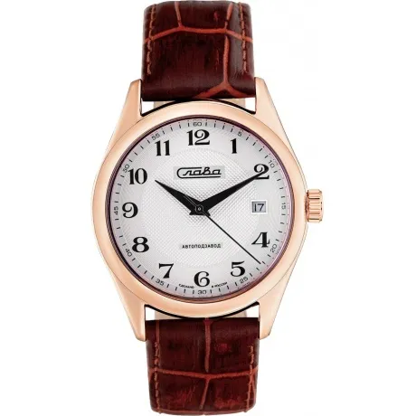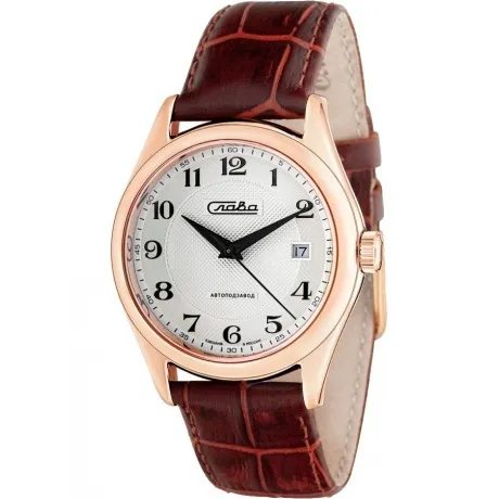 Мужские механические наручные часы Слава. Присутствует окошко даты. Циферблат закрывает устойчивое к потертостям и царапинам сапфировое стекло. Ремешок с классической застежкой. Вес часов 60 грамм.