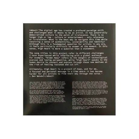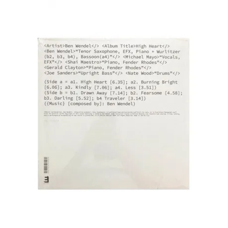 Ben Wendel - High Heart (5060509791064) виниловая пластинка - описание товара, его характеристики, фото и цены представлены на карточке товара. Чтобы купить этот товар по цене 5209 руб., свяжитесь с нами по телефону 8(800)505-43-75 в Нижнем Новгороде, или оформите покупку через корзину.