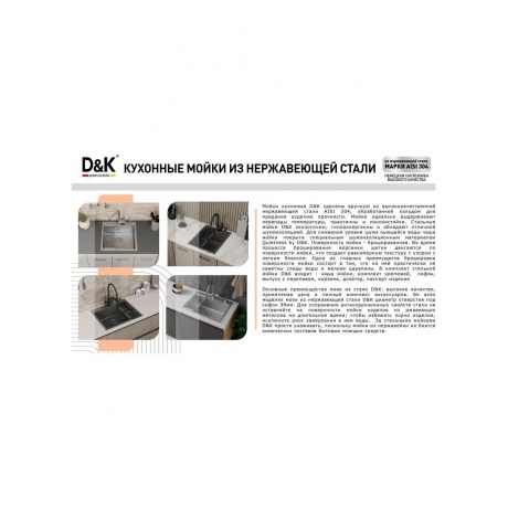 Мойки кухонные D&K сделаны вручную из высококачественной нержавеющей стали AISI 304, обработанной холодом для придания изделию прочности. Мойки идеально выдерживают перепады температуры, практичны и износостойки. Стальные мойки D&K экологичны, гипоаллергенны и обладают отличной шумоизоляцией.