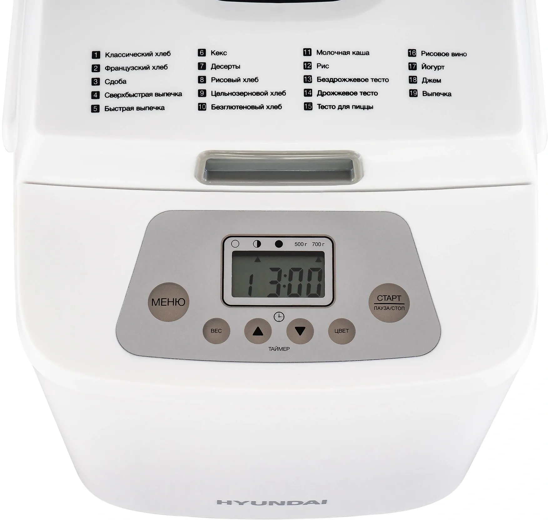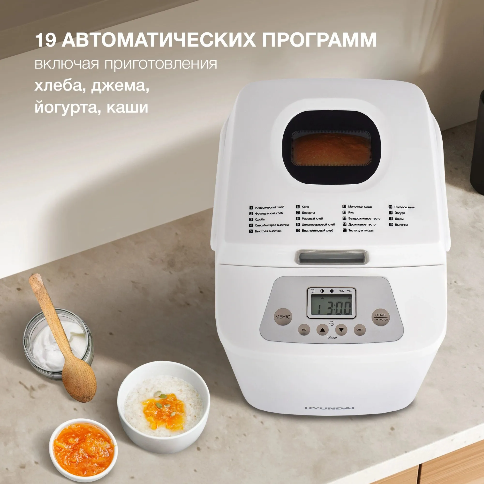 В Hyundai HYBM-1088 предусмотрено 19 автоматических программ, включая 3 режима замеса теста. Благодаря функции выбора цвета корочки можно получить хрустящую румяную корку нужной степени — светлую, среднюю или тёмную. По окончании выпечки прибор автоматически переходит в режим поддержания температуры, сохраняя хлеб тёплым до 60 минут без пересушивания.