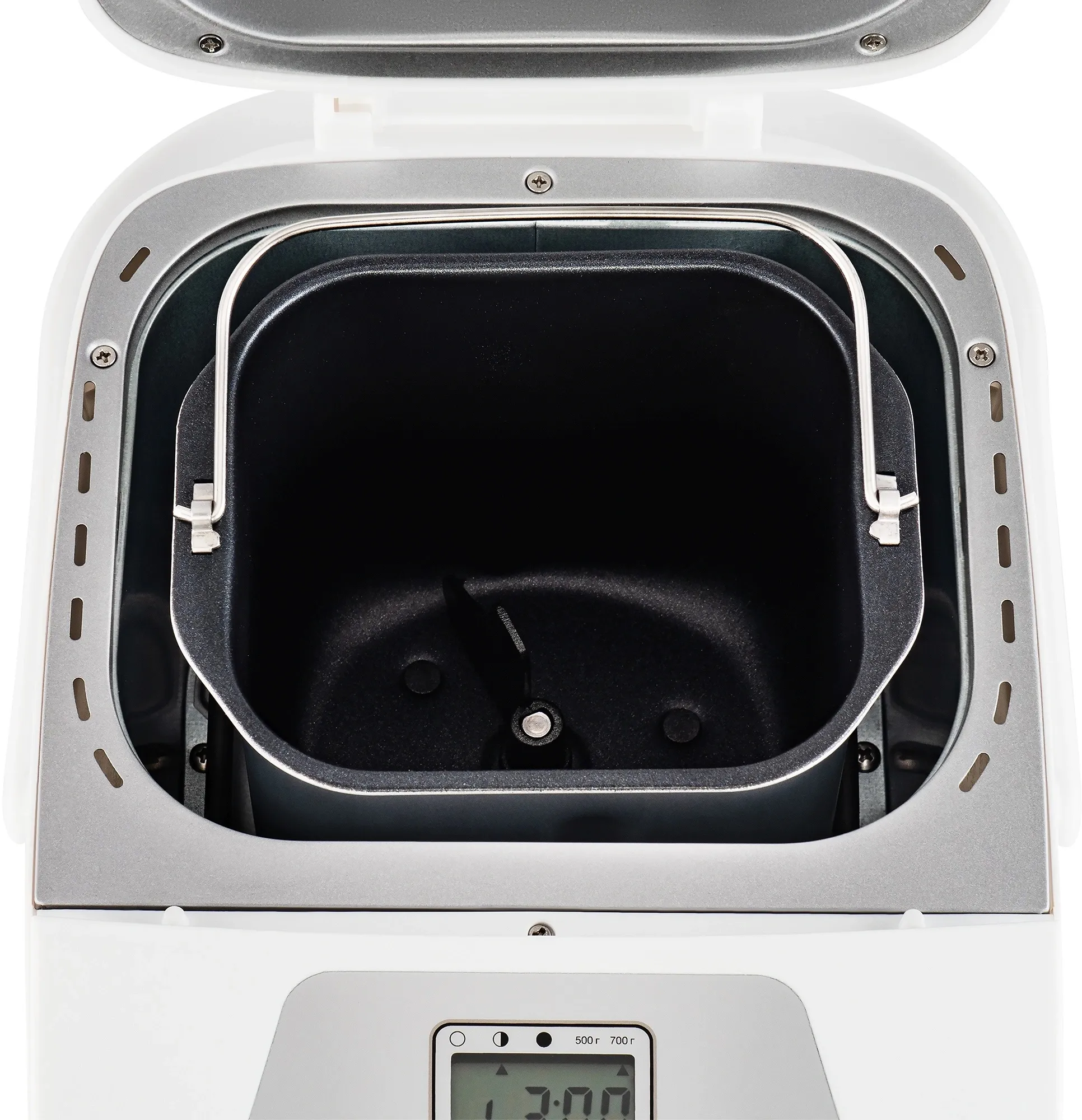 Форма для выпекания покрыта антипригарным слоем, что облегчает уход и гарантирует аккуратное извлечение готового изделия. Прозрачное смотровое окно на крышке позволяет наблюдать за процессом, не открывая устройство. Даже при кратковременном отключении электроэнергии до 10 минут программа продолжит выполнение благодаря встроенному запасу памяти. Это особенно важно при длительных циклах замеса и выпечки.