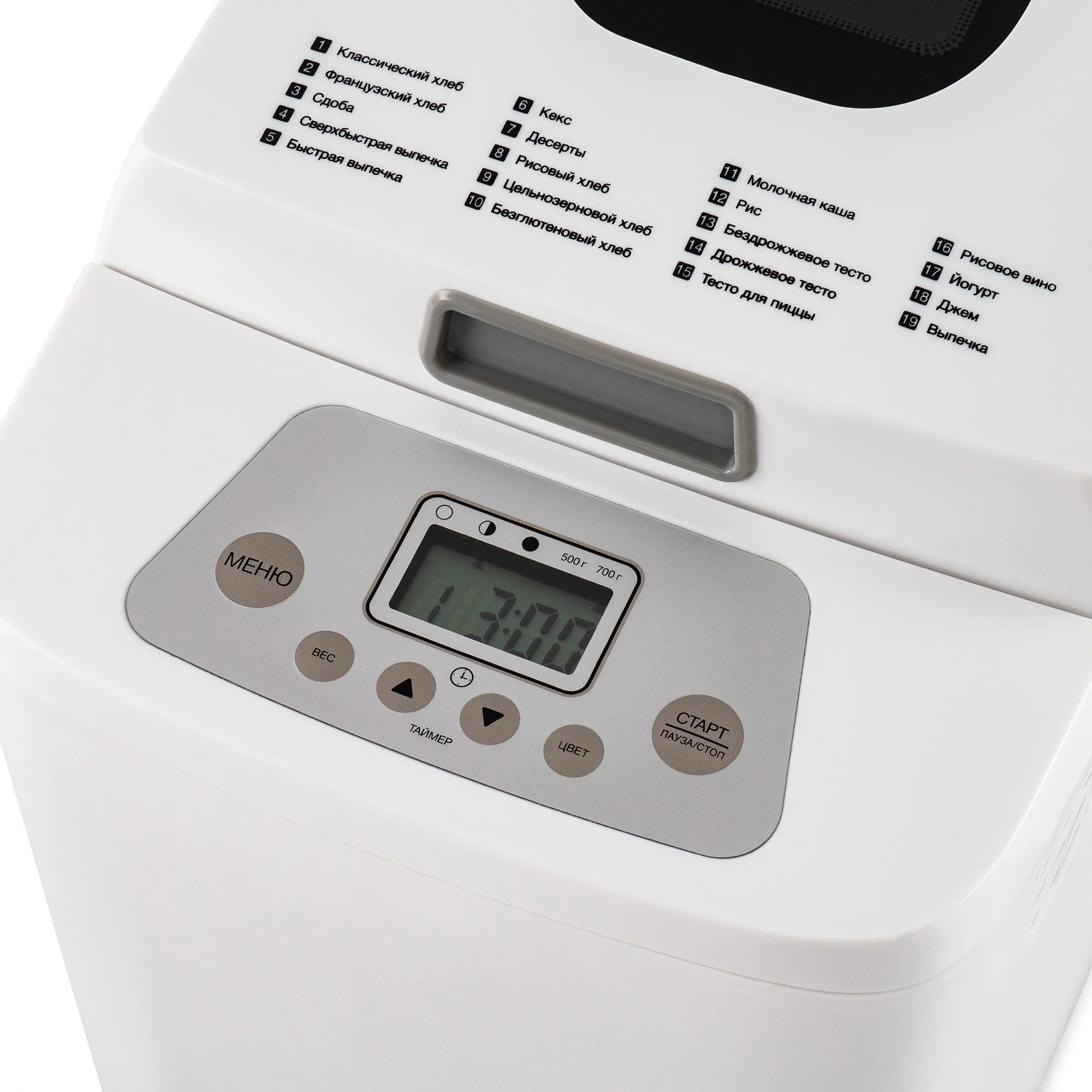 Устройство рассчитано на максимальный вес выпечки до 750 граммов, что позволяет готовить свежий хлеб для всей семьи. Можно выбрать размер буханки — 500 или 750 граммов — в зависимости от потребностей. Таймер отсрочки старта до 15 часов помогает заранее запланировать процесс, чтобы горячий хлеб был готов именно к завтраку или ужину.