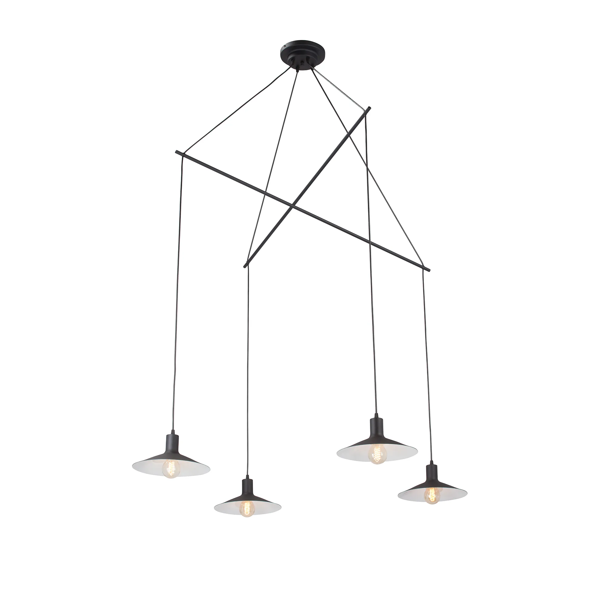 люстра v4825-1/4s на четыре лампы под цоколь e27, в грубоватом и одновременно изысканном стиле ар-деко, подвесной светильник с черным каркасом и металлическими плафонами, мощность каждой лампы до 40 вт, высота 175 см, ширина 130 см