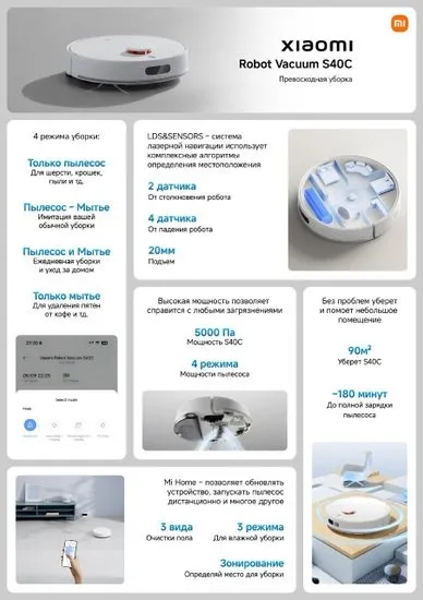Описание товара Робот-пылесос Xiaomi Robot Vacuum S40C (BHR9664EU)