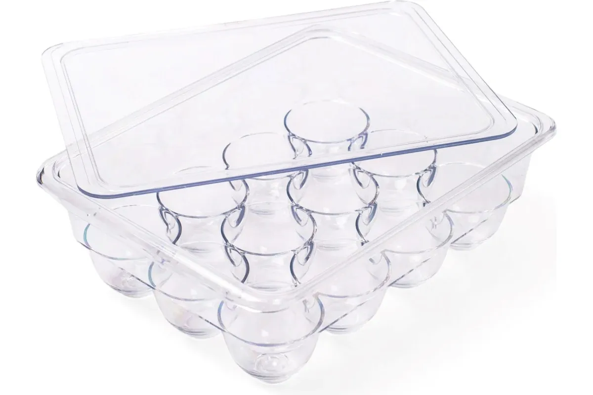Контейнер изготовлен из прочного пластика, который не деформируется при ударах и падениях, обеспечивая сохранность яиц внутри.