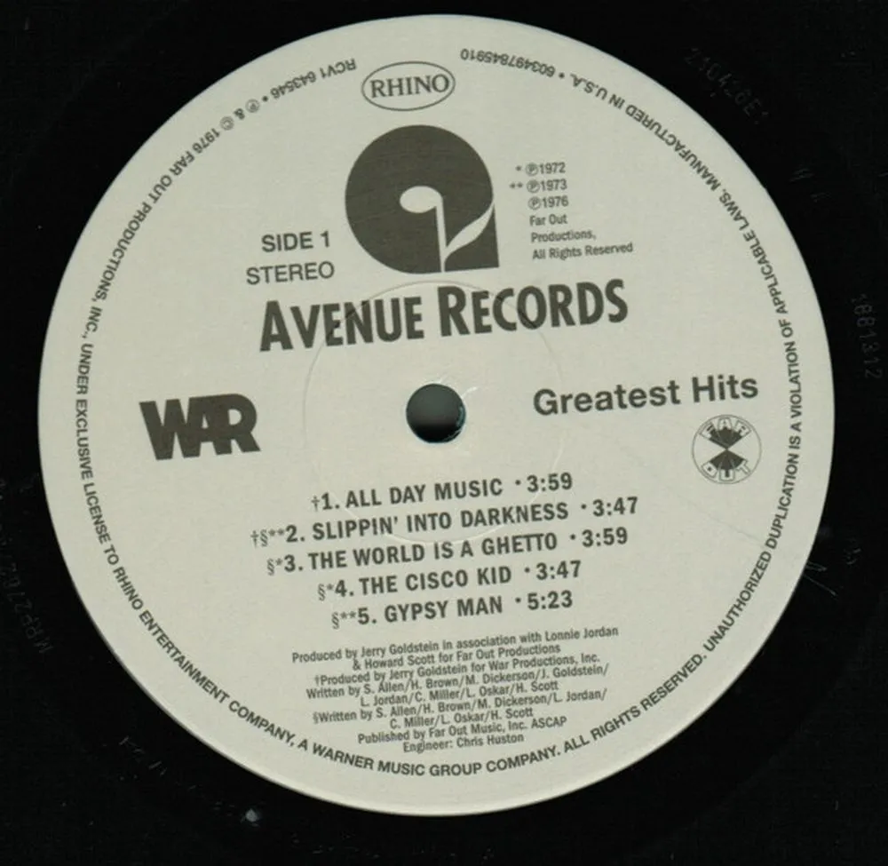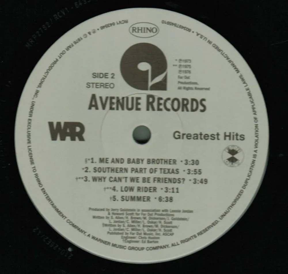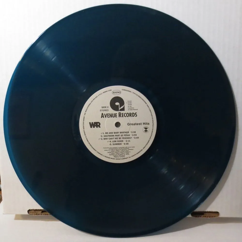 Переиздание на цветном виниле альбома Greatest Hits американской фанк-рок-группы War, выпущенного в 1976 году. Лимитированное издание на цветном виниле. Greatest Hits, выпущенный в 1976 году, который не выпускался на виниле с 70-х годов, теперь издается на золотом виниле. В альбом вошли их самые популярные хиты, включая "Slippin' Into Darkness", "Why Can't We Be Friends?" а также их культовый хит «Low Rider». Звук был взят с оригинальных лент, обложка воспроизведена точно.