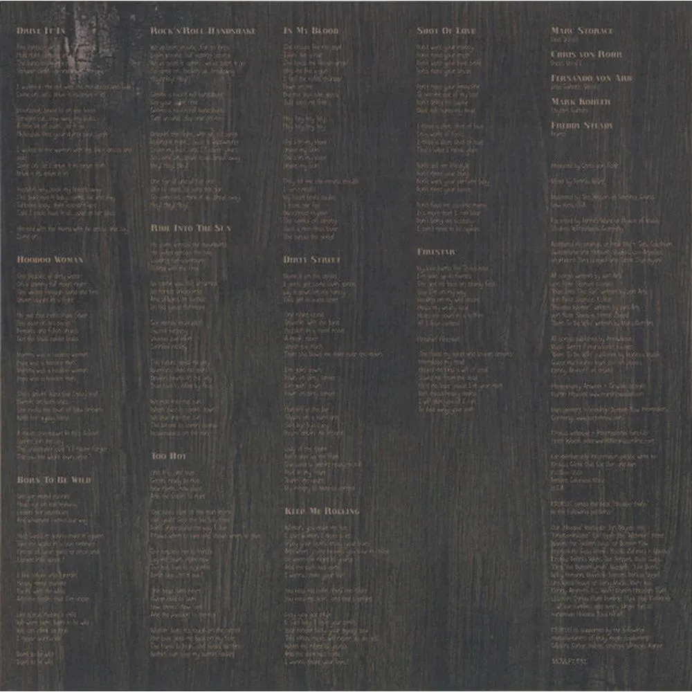 Drive It In, Hoodoo Woman, Wild, Rock'n Roll Handshake, Ride Into The Sun, Too Hot, In My Blood, Dirty Street, Keep Me Rolling, Shot Of Love, Firestar