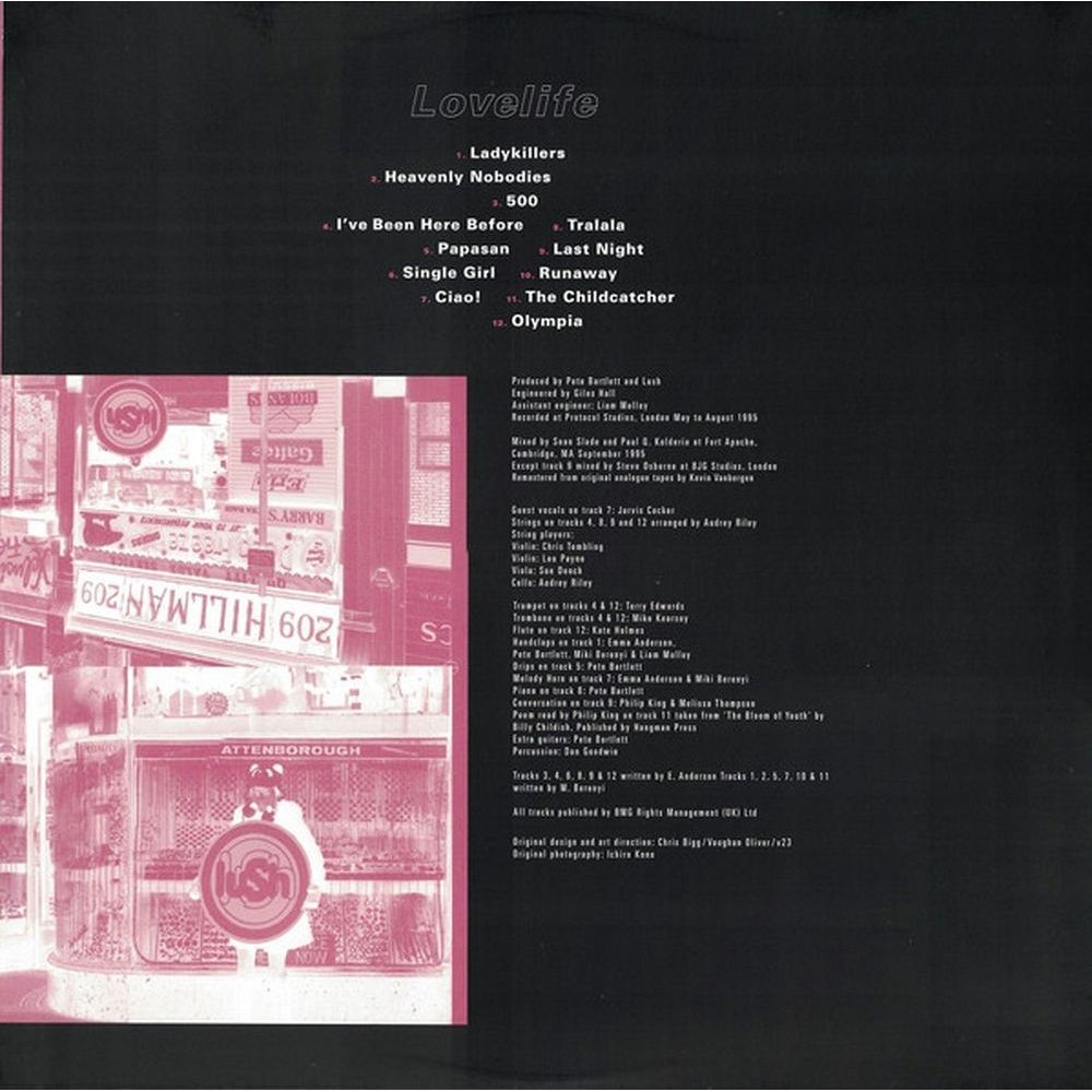LP — чёрный винил. Lovelife использует обложку из своего бокс-сета 2016 года, чтобы сохранить коллекционную кальку 1996 года, эксклюзивную для того первого тиража. Ожидание окончено. Все три студийных альбома Lush наконец-то вернутся в печать на виниле с 11 августа 2023 года. Созданные вокруг талантов авторов песен Эммы Андерсон и Мики Берени Lush успешно определили множество сцен 90-х, таких как шугейз, дрим-поп и брит-поп, прежде чем они распались в 1998 году. Всеми любимая группа, которая ненадолго воссоединилась в 2016 году, в последние годы увидела, как новая, молодая аудитория влюбилась в их музыку, открыв ее через TikTok, Spotify и др. И за исключением роскошного ретроспективного бокс-сета карьеры Record Store Day в 2016 году, все три студийных альбома - Spooky (1992), Split (1994) и Lovelife (1996) - были недоступны на виниле с 90-х годов. С высоким спросом группа работала с известным звукорежиссером и продюсером Кевином Ванбергеном, чтобы помочь им сделать ремастеринг своего каталога, начиная со студийных альбомов. Используя оригинальные ?-дюймовые производственные ленты в качестве исходного материала, Кевин кропотливо работал над ними, чтобы создать совершенно новые, потрясающие 24-битные мастер-записи, которые идеально передают волнение оригиналов. Они никогда не звучали так хорошо. Известно, что Lush работает с собственными дизайнерами v23 4AD над каждым релизом, и обложка альбома всегда была центральной частью привлекательности Lush. Для этих переизданий первые два альбома будут помещены в их оригинальные дизайны, в то время как Lovelife использует обложку из своего бокс-сета 2016 года, чтобы сохранить коллекционный конверт из кальки 1996 года эксклюзивным для того первого тиража. Для этих новых тиражей все три названия выйдут как на классическом черном виниле, так и на ультра-прозрачном виниле - последний - одноразовый. Вышедший 5 марта 1996 года, последний студийный альбом Lush Lovelife назывался «брит-поп феминистским контрапунктом, в котором он так нуждался» ( Pitchfork ). Спродюсированный Питом Бартлеттом (Therapy?, Kitchens of Distinction), альбом включает три самых популярных сингла группы: « Single Girl », « Ladykillers » и « 500 ( Shake Baby Shake )», а Джарвис Кокер также принял участие в заключительном треке первой половины альбома « Ciao! ».