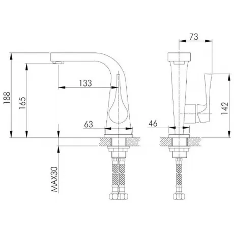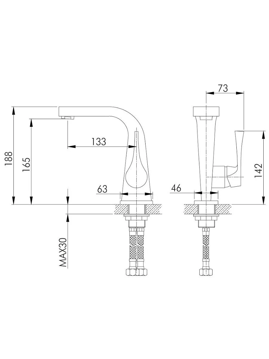 Смеситель устанавливается на умывальник посредством крепежа. Управлять процессом включения и смешивания воды можно с помощью одной ручки с керамическим картриджем.