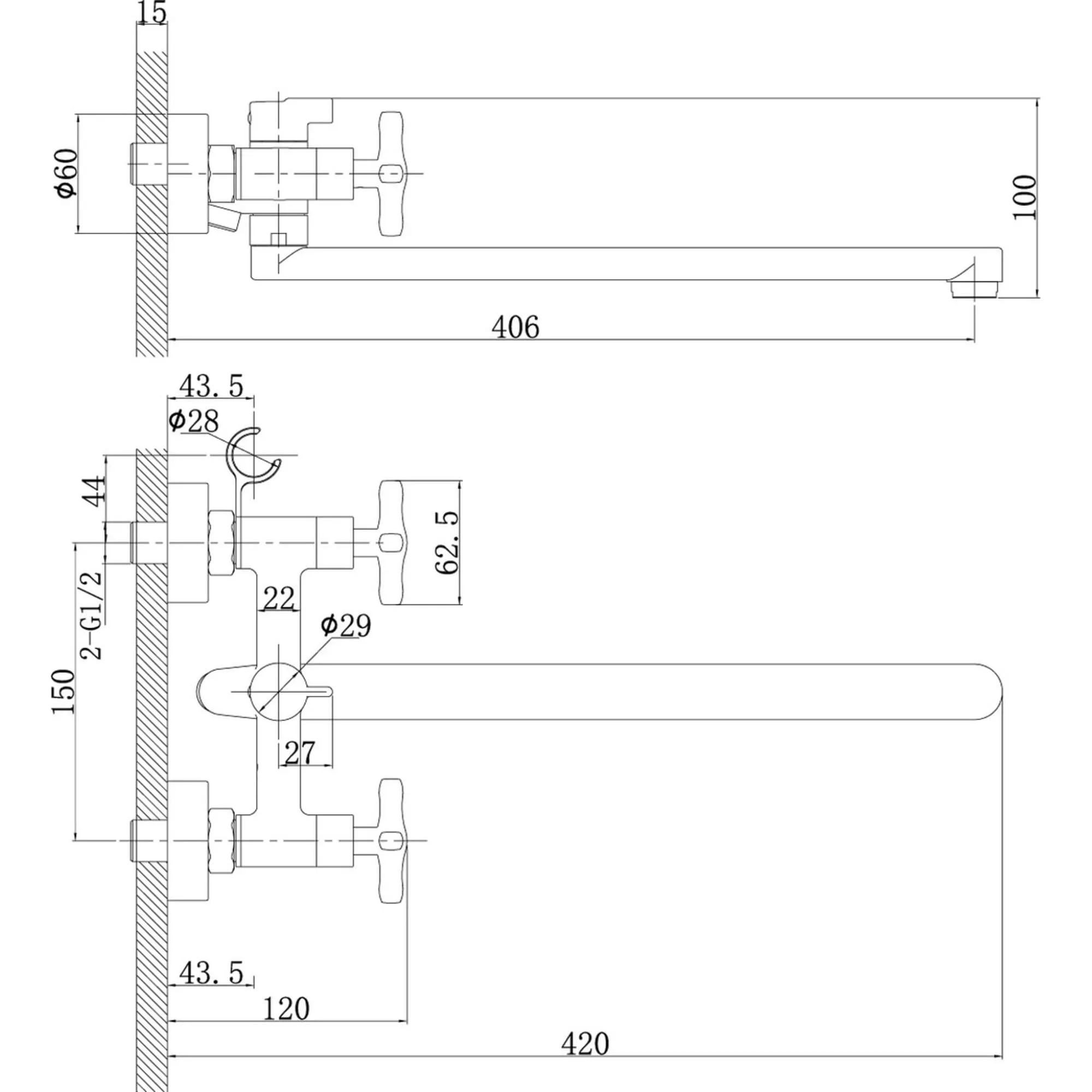 Двухзахватный смеситель устанавливается на стену. Управлять процессом включения и смешивания воды можно с помощью двух ручек с керамическими кран-буксами и плоского поворотного излива.