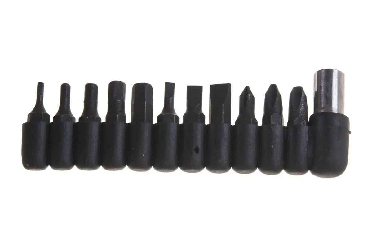 Простенький, крепенький, вроде надёжный, удобный размер насадок к отвёртке, удобный чехол с отдельным карманчиком для бит.