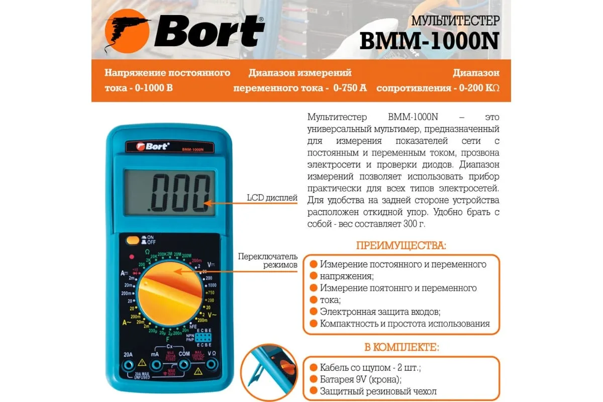 Мультиметр Bort BMM-1000N - фото, характеристики, описание и цена представлены на карточке товара. Для того чтобы купить этот товар по цене 960 руб., вам надо или позвонить по телефону 8(800)505-43-75 в Новосибирске, или оформить покупку в личном кабинете, добавив товар в корзину.