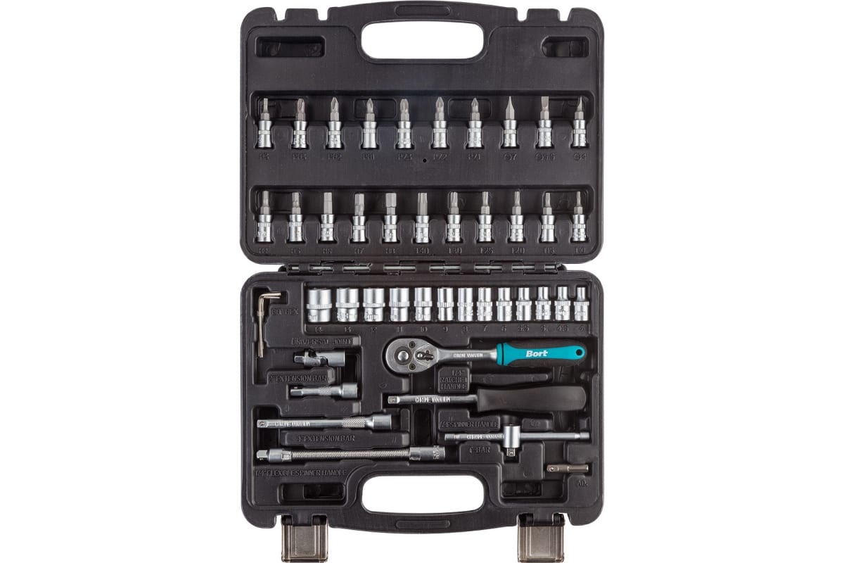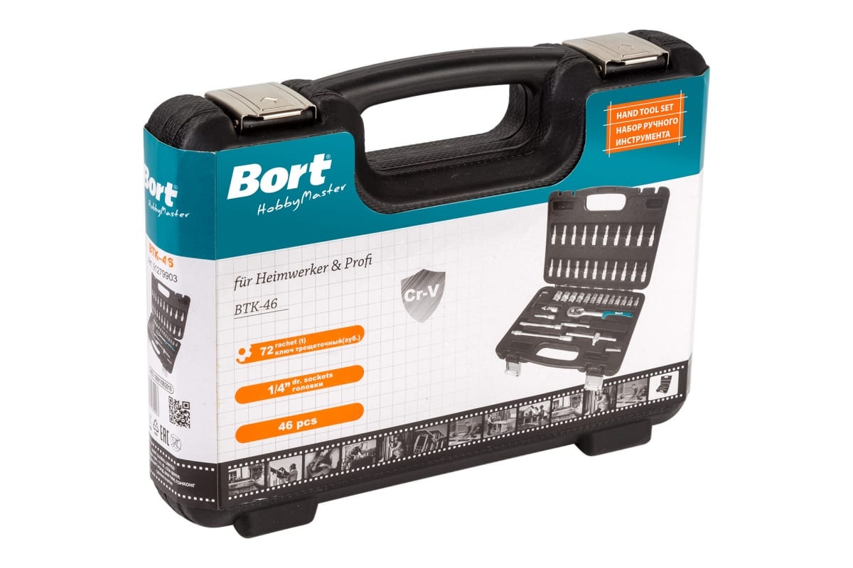 Набор ручного инструмента BORT BTK-46 91279903 подойдет для работы на даче, в доме, в автомобиле. Комплект включает в себя головки и биты для различных форматов крепежа. Инструменты помещены в стильный легкий кейс для удобного хранения и транспортировки. Улучшенные петли и замки обеспечивают удобное применение в течение всего срока службы