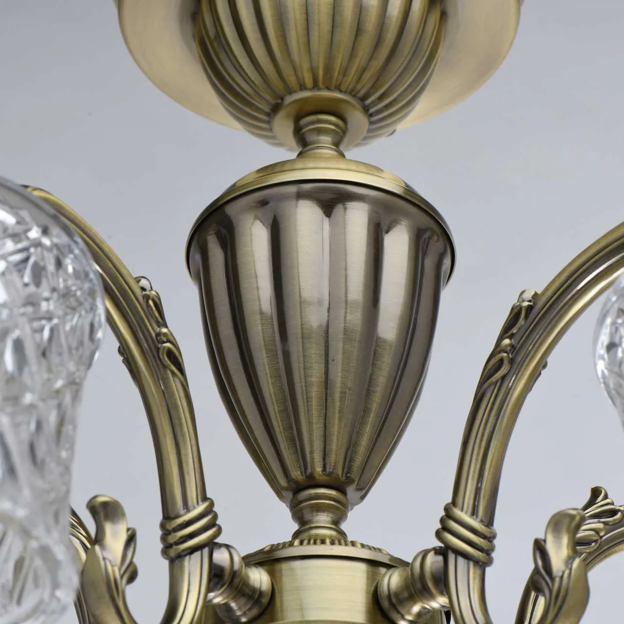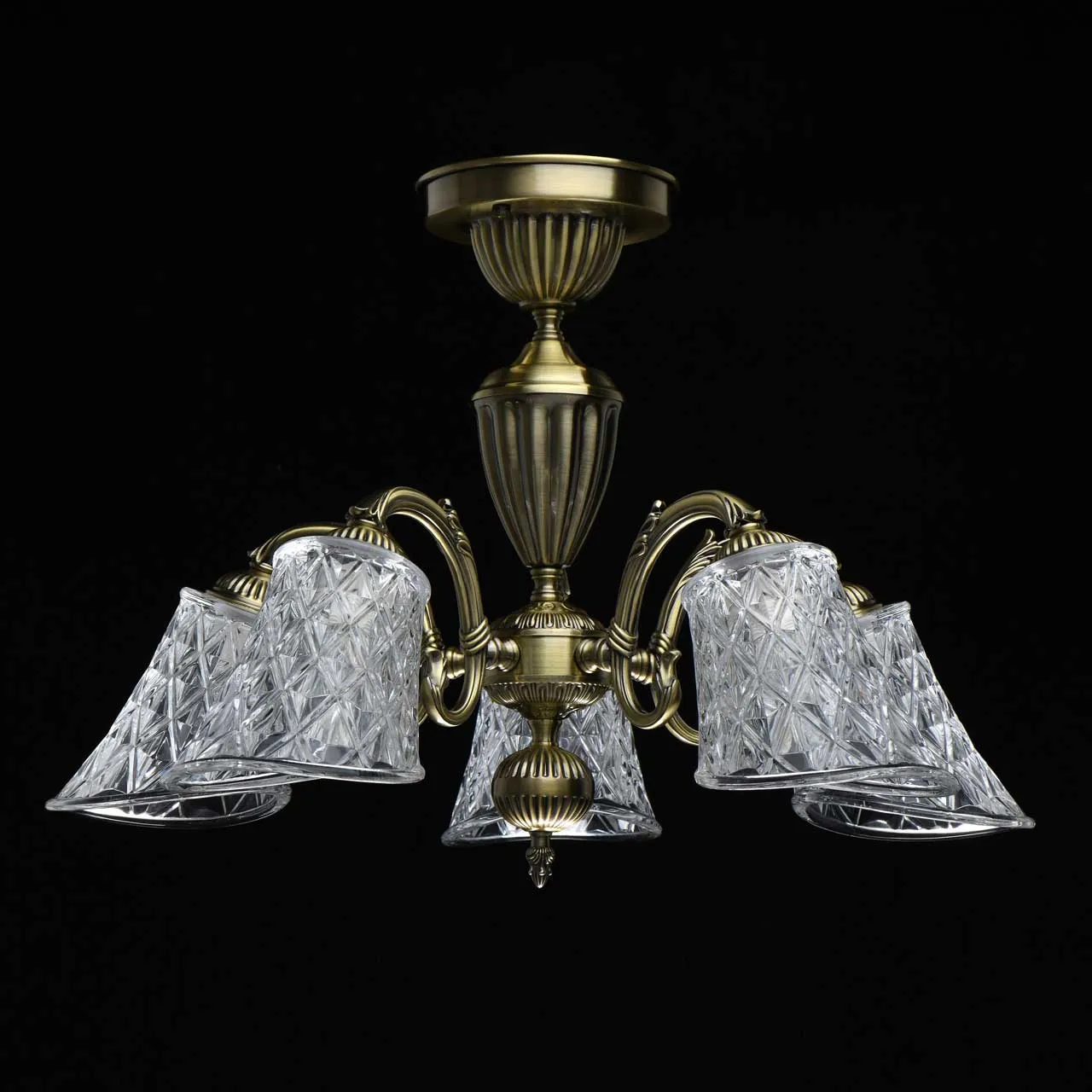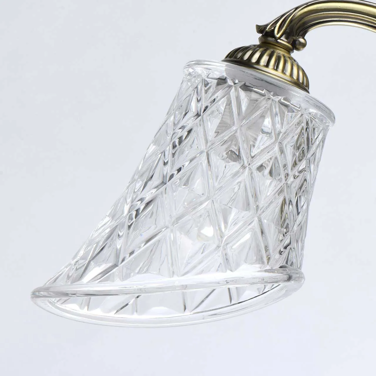 Классическая форма светильника цвета античной бронзы в тренде. Компактная высота для стандартной высоты потолка.Плафоны прозрачного стекла с алмазной огранкой создают игру света.Декор художественного литья на рожках