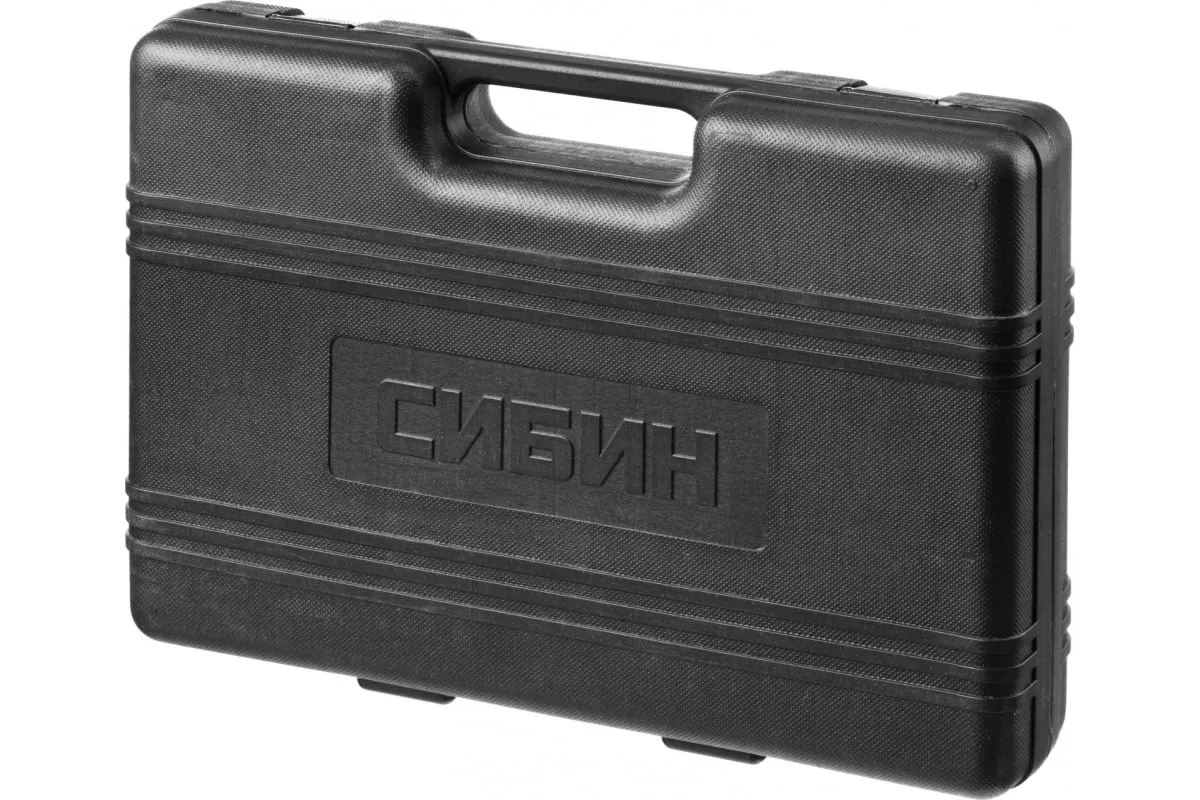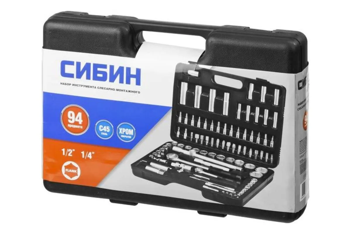 Набор инструментов Сибин 27765-H94 (94 предмета) – универсальный набор инструментов для слесарных и монтажных работ или мелкого ремонта автомобилей. Включает в себя 94 предмета. Вес 5,7 кг. Пригодится дома, в частной мастерской, гараже или на даче. Инструменты изготовлены из легированной стали и устойчивы к износу. Выдерживают большие нагрузки и защищены от образования ржавчины. Эргономичные рукоятки обеспечивают удобный хват. Не выскальзывают из голых ладоней или перчаток. В пластиковом кейсе инструменты и оснастка разделены по ячейкам. Удобно брать набор с собой на выездные работы. Комплектация: Торцевая головка 1/2 (мм): 10, 11, 12, 13, 14, 15, 16, 17, 18, 19, 20, 21, 22, 23, 24, 27, 30, 32 – 18 шт., Торцевая головка 1/4 (мм): 4, 4.5, 5, 5.5, 6, 7, 8, 9, 10, 11, 12, 13, 14 мм – 13 шт., Торцевая головка удлиненная 1/2 (мм): 14, 15, 17, 19 - 4 шт., Торцевая головка удлиненная 1/4 (мм): 6, 7, 8, 9, 10, 11, 12, 13 - 8 шт., Торцевая свечная головка 1/2 (мм): 16, 21 - 2 шт., Трещотка 1/2 и 1/4 - 2 шт., Адаптер 1/2х3/8, Шарнир карданный 1/2 и 1/4 - 2 шт., Удлинитель 1/2 (мм): 125, 250 - 2 шт., Удлинитель 1/4 (мм): 50, 100 - 2 шт., Переходник для бит 1/2”x5/16”, Удлинитель гибкий 1/4 100 мм, Т-образный вороток 1/4, Вороток-отвёртка 1/4 150 мм, Переходник для бит 1/4, Ключ имбусовый (мм): 1.5, 2, 2.5 - 3 шт., Биты 1/4 – 17 шт., Биты 5/16 – 15 шт., Инструкция, Кейс.