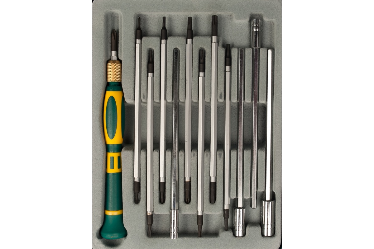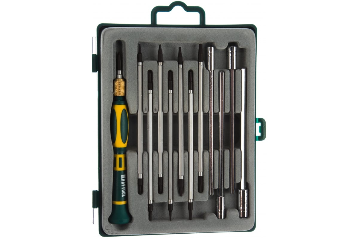 Набор отверток для точных работ KRAFTOOL 25611-H12 применяется для монтажа электроприборов, сборки и ремонта часов. Поставляется в удобном пластиковом кейсе с прозрачной верхней крышкой и хомутом для подвеса. Стальные стержни надежно закрепляются в рукоятке. Набор состоит из двухкомпонентной рукоятки с зажимным механизмом, торцевых головок (4 шт) и двухсторонних бит (8 шт).