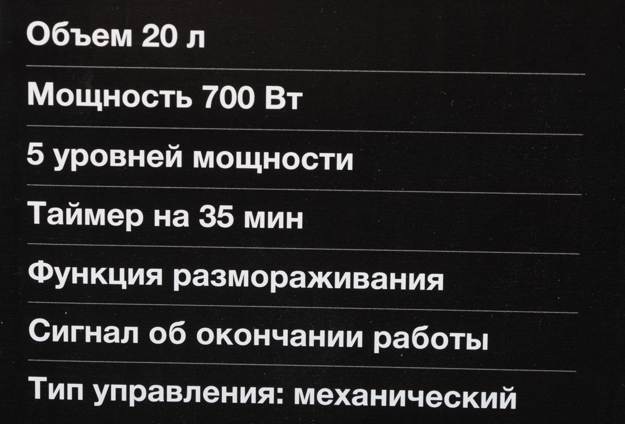 Hyundai HYM-M2059 объемом 20 литров. Проста в обращении - при помощи поворотных переключателей легко выбрать подходящий вам режим приготовления. Таймер на 35 минут поможет контролировать процесс.