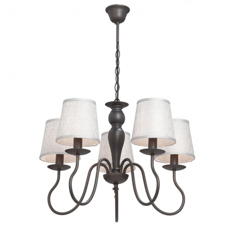 Основа люстры выполнена из металла серого цвета, плафон из ткани белого цвета. Люстра будет хорошо смотреться в гостиной, спальне, кухне и удачно впишется в интерьер в стиле классический. Модель имеет 5 плафонов и 5 лампочек, оснащена цоколем E14 с максимальной мощностью лампочки 60 Вт и рассчитана на освещение площади до 15 кв. м. Диаметр модели — 60 см. Степень защиты от влаги и пыли — IP20. Люстра устанавливается на металлический крюк.