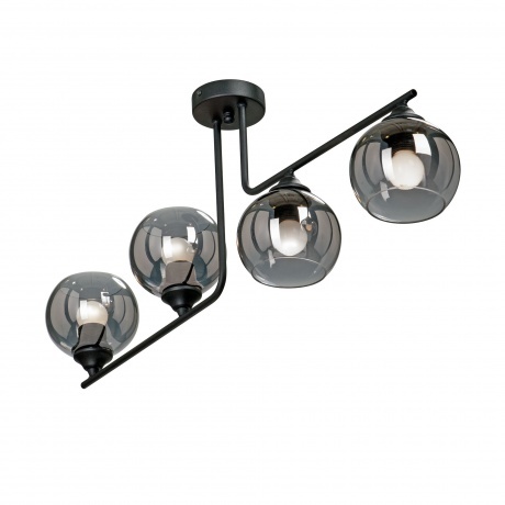 Потолочная люстра на штанге будет отлично смотреться в гостиной, прихожей и коридоре, спальне в стиле арт-деко. Люстра имеет 4 плафона из черного прозрачного стекла с цоколем 4xE27. Питание от сети 220V, общая максимальная мощность 160W позволяет осветить площадь до 8 кв. м.
