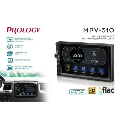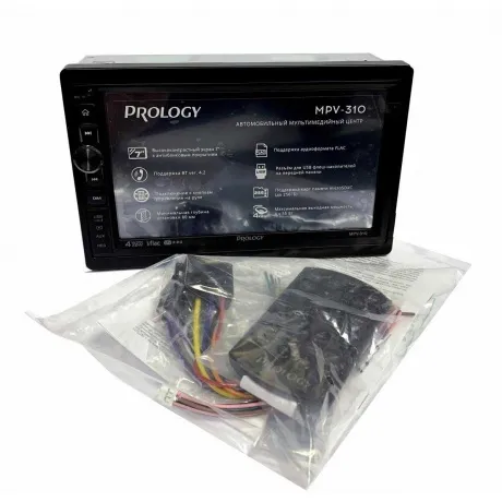 Автомобильный мультимедийный центр PROLOGY MPV-310 монтажного размера 2DIN обеспечивает прием радиостанций в диапазоне FM, воспроизведение медиафайлов, записанных на карты памяти USB / microSD, передачу звука с внешних источников, а также управление мобильным телефоном через интерфейс Bluetooth (version 4.2). Поддерживается подключение штатных кнопок управления аудиосистемой на руле (интерфейс SWC).
